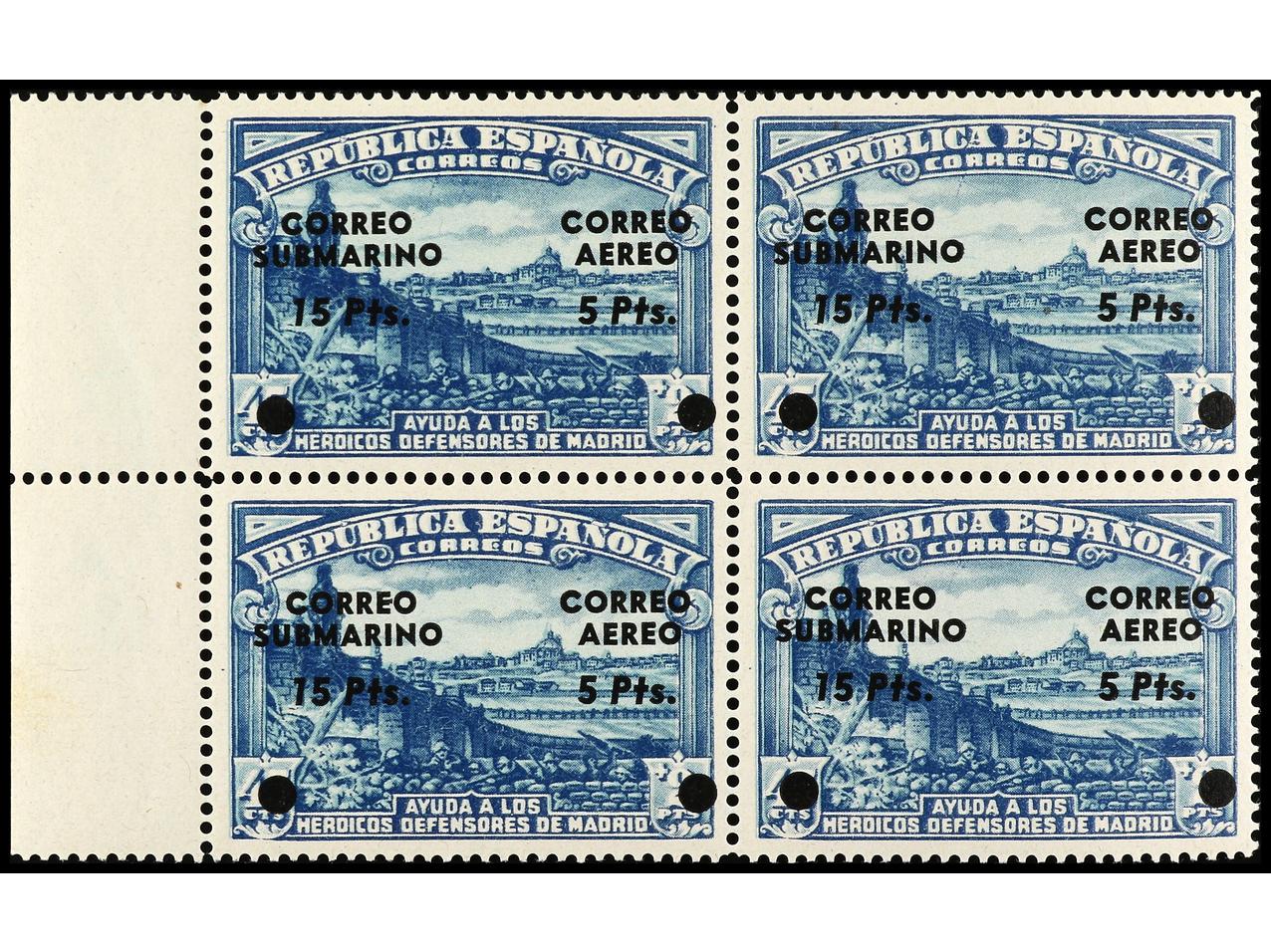 ESPAÑA. 45 cts. + 2 pts. azul. Habilitado CORREO SUBMARINO 15 PTS/CORREO AEREO 5 PTS. en bloques de cuatro. FANTASÍA. Ed.757FN (4). Cat. +372€.