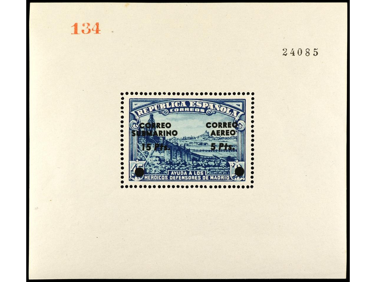 ESPAÑA. Aéreo + 5 pts. ENSAYO SIN DENTAR. Al dorso impresión del 757s. Habilitación DESPLAZADA LATERALMENTE. MUY RARO sólo existe una hoja. Cert. CEM. Ed.759s.