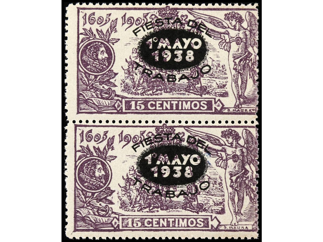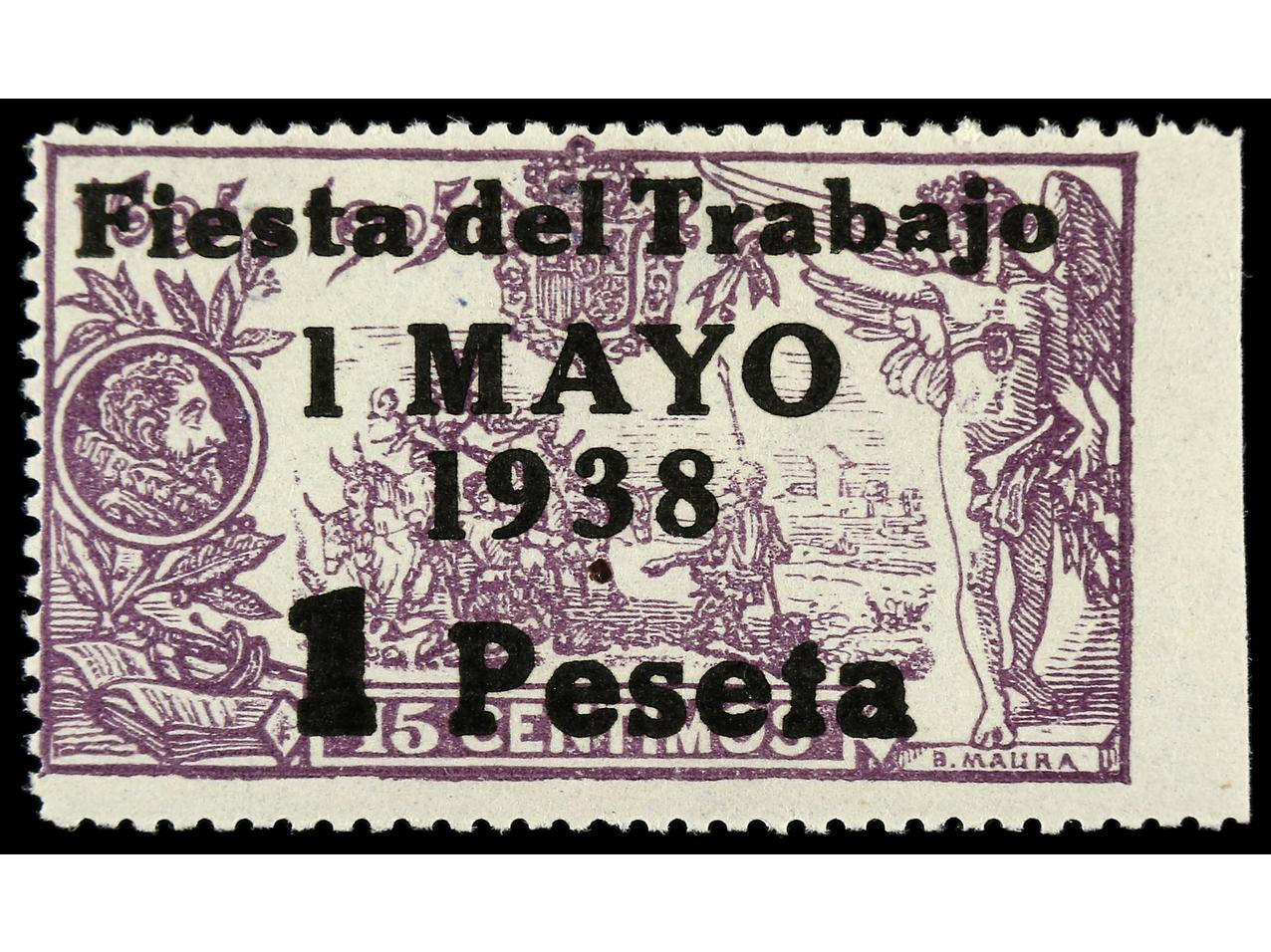ESPAÑA. 1 pta. s. 15 cts. violeta. Pareja ´FIESTA DEL TRABAJO´ y ´45´ en rojo, en pareja con HABILITACIÓN ´FIESTA DEL TRABAJO´ en rojo y ´1 PESETA´ en negro. RARÍSIMA, sólo existen 5 parejas. Cert. GRAUS. Ed.762hepcc. (Image1)