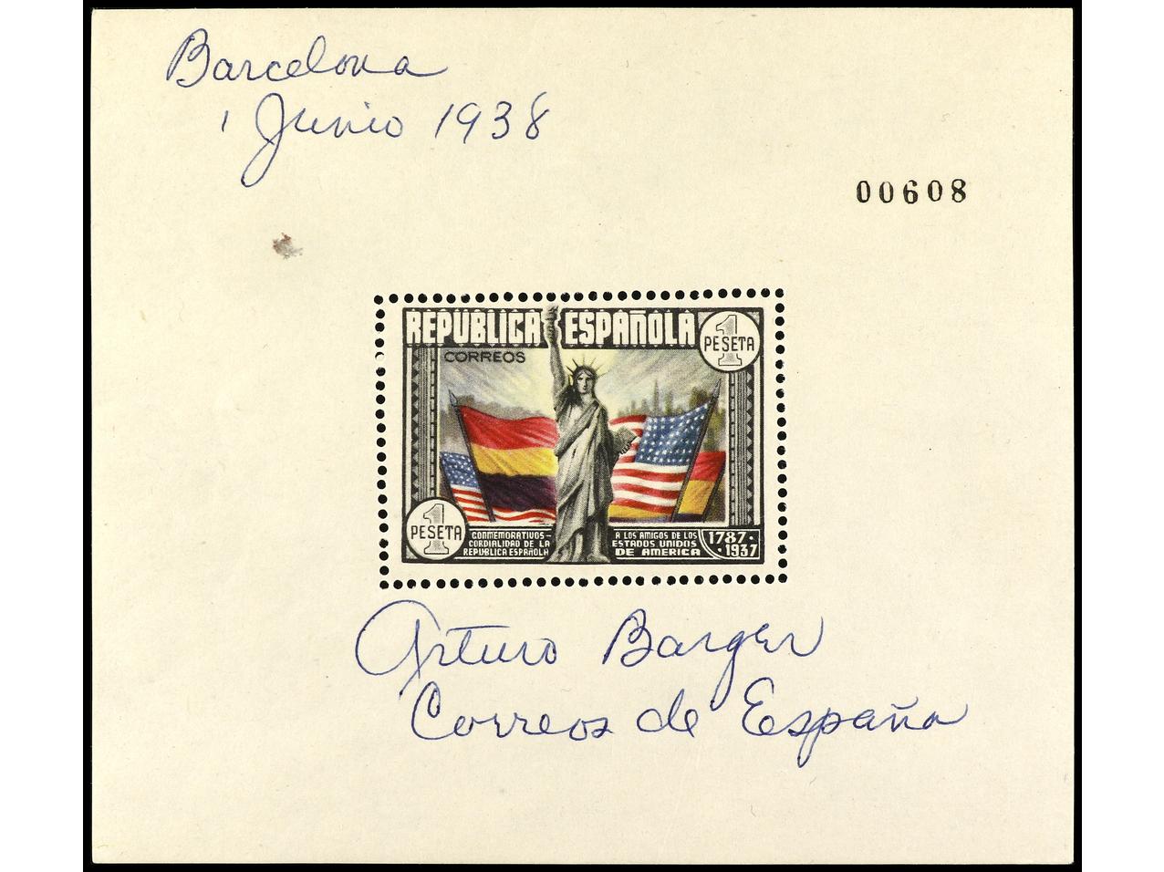 ESPAÑA. HB con firma manuscrita ´ARTURO BARGER´ y Barcelona 1 junio 1938. RARA. Ed.764. (Image1)