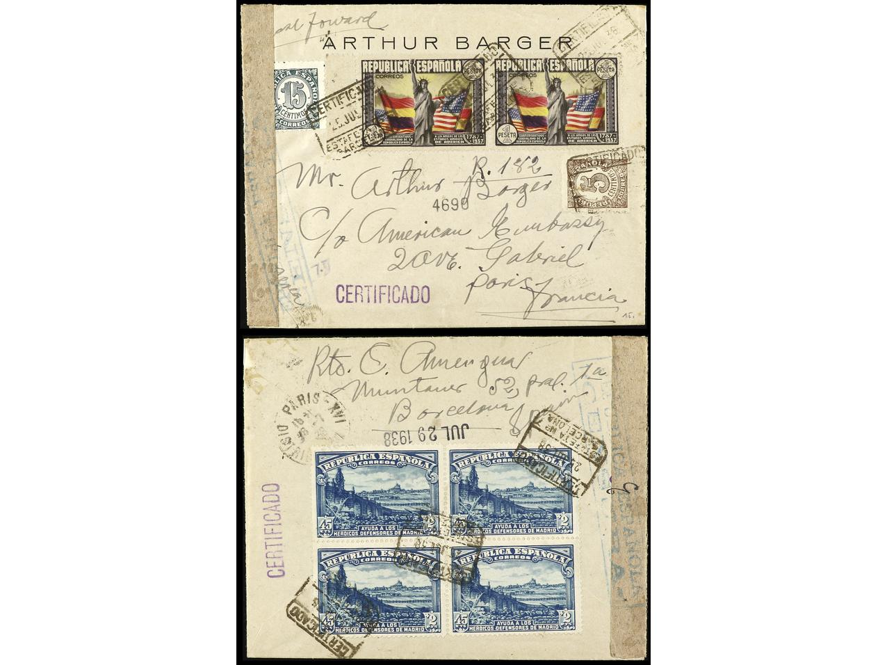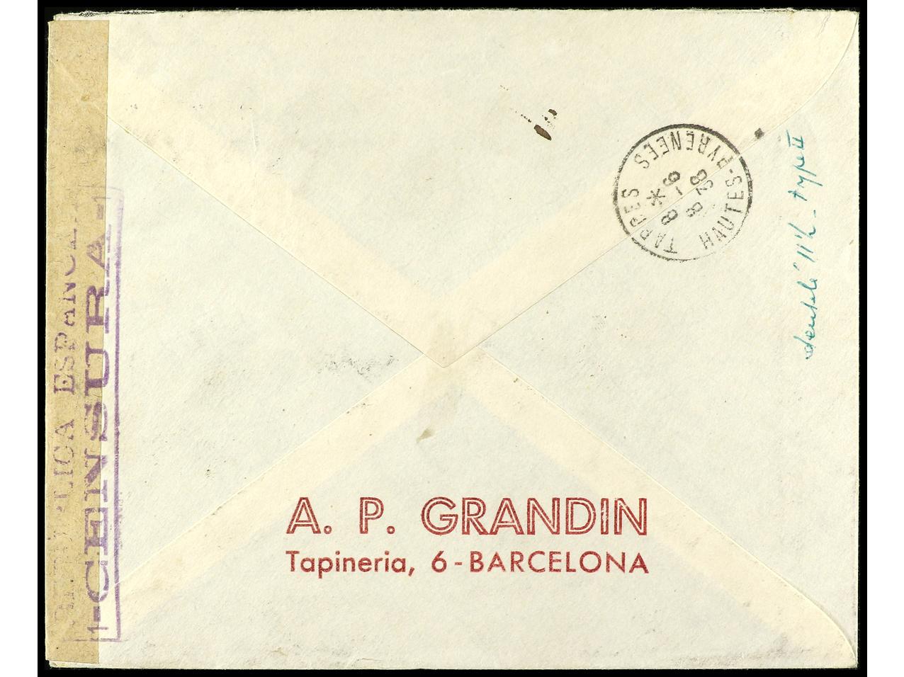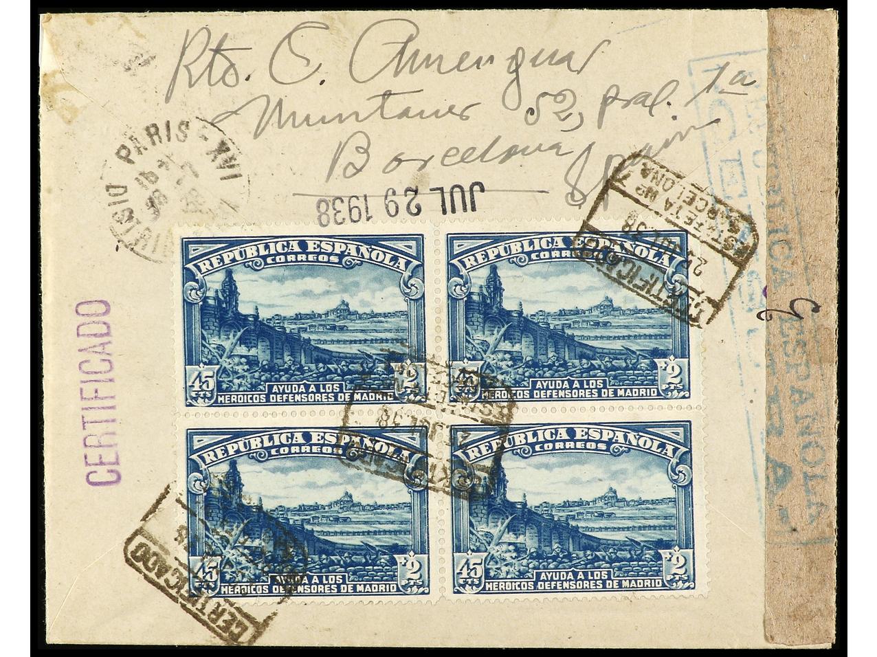ESPAÑA. 1938. BARCELONA a FRANCIA. 1 pta. multicolor (2) y al dorso bloque de cuatro del 45 cts. + 2 pts. azul, al dorso llegada. Ed.763 (2), 757 (4).
