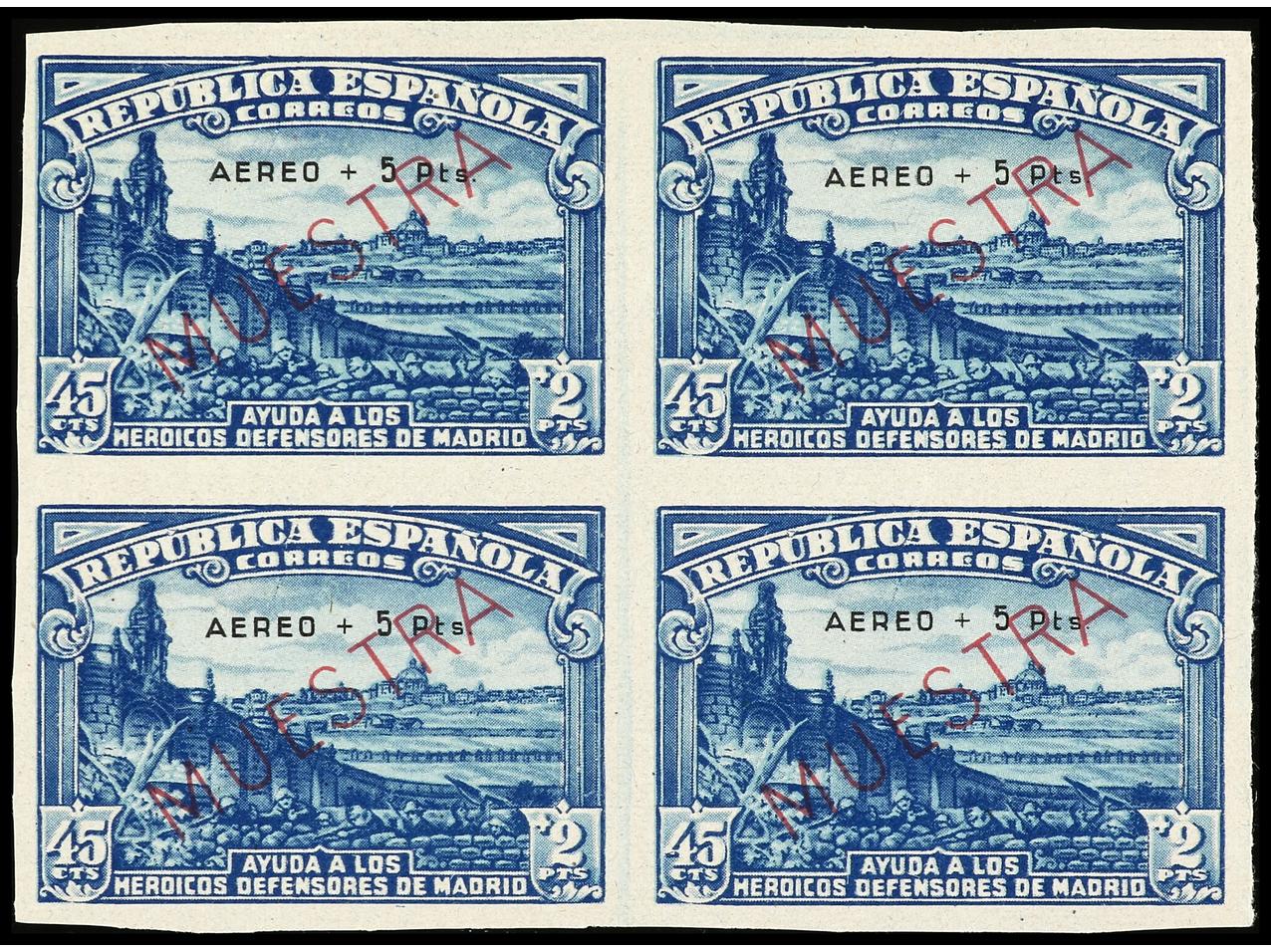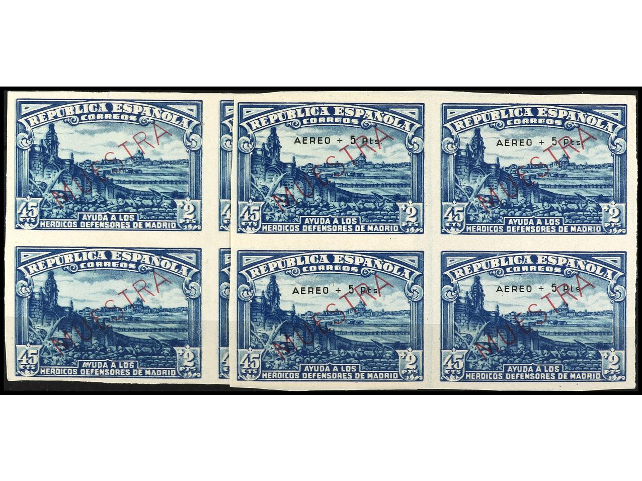 ESPAÑA. Aéreo + 5 pts. HABILITACIÓN MUESTRA SIN DENTAR en bloque de cuatro y 45 cts. + 2 pts. mismas características con la variedad 757t. Emitidos sin goma. Ed.759M y 757Ms. Cat. 2.192€. (Image1) (Image2)