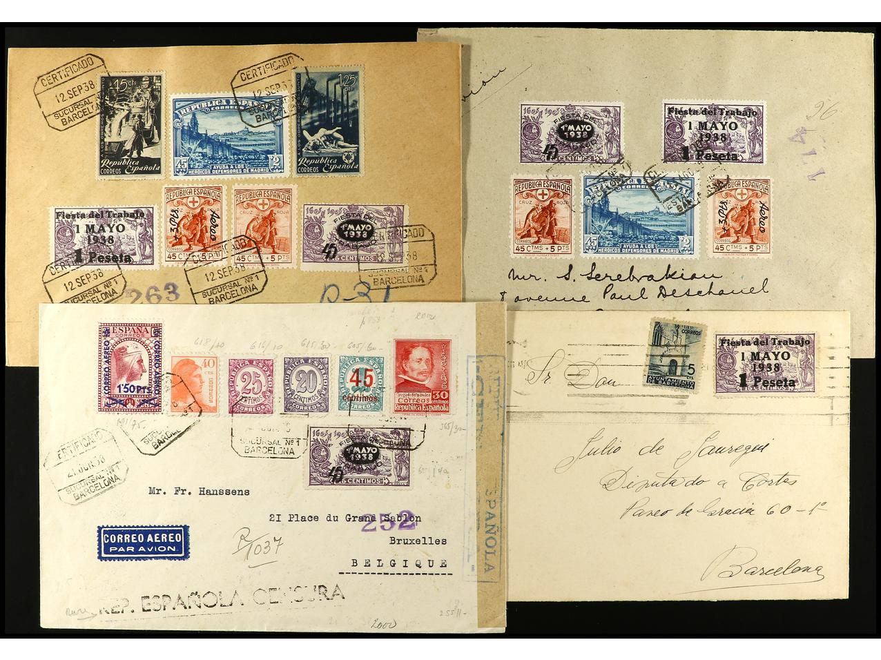 ESPAÑA. 1938. FIESTA DEL TRABAJO. Conjunto de cuatro sobres con diversos franqueos. (Image1)