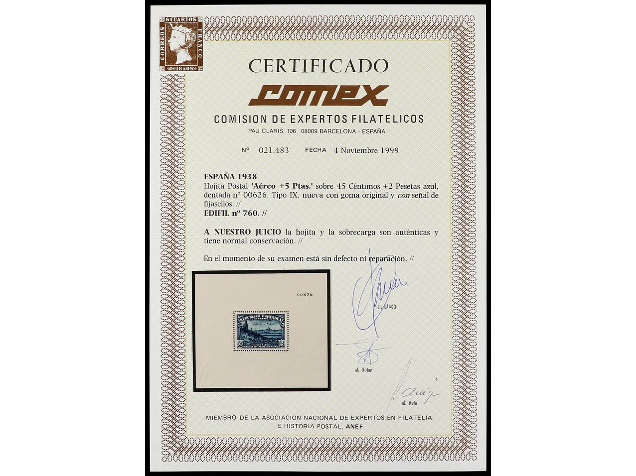 ESPAÑA. Aéreo + 5 pts. Hoja bloque. Cert. COMEX. Ed.760. Cat. 4.000€. (Image1) (Image2)