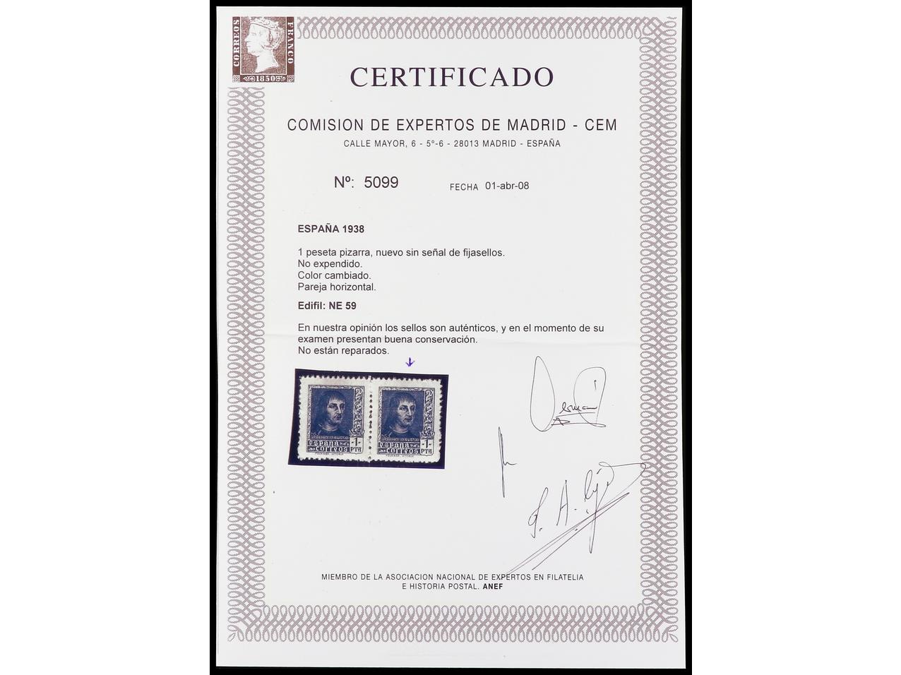 ESPAÑA. 1 pta. pizarra. ERROR DE COLOR. No reseñado. MUY RARO. Cert. CEM (de la pareja de donde procede). Ed.NE 59ec. (Image1) (Image2)
