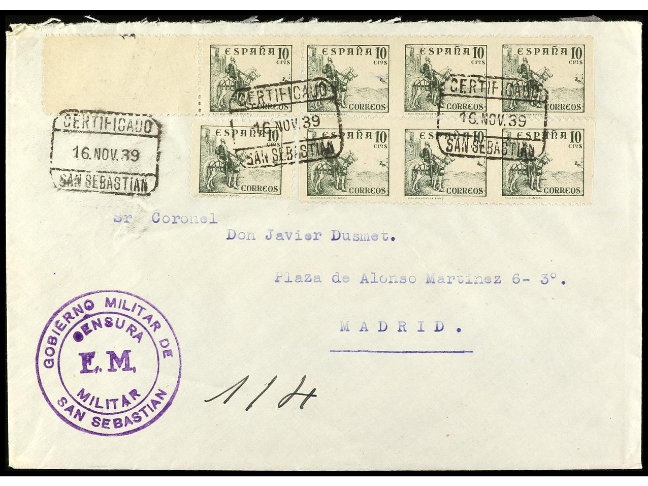 ESPAÑA. 1939. S. SEBASTIÁN a MADRID. 10 cts. verde, dos sellos normales y dos tiras de tres SIN DENTADO VERTICAL, raros en carta circulada, al dorso llegada. Ed.817sv + 817. (Image1) (Image2)