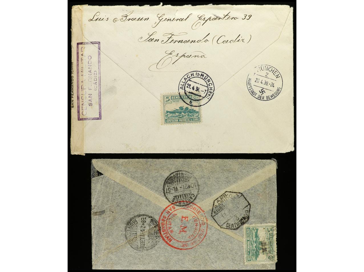 ESPAÑA. 1937-40. CID E ISABEL. Conjunto de dos cartas circuladas a Alemania y Uruguay, una con el 4 pts., al dorso llegadas. (Image1) (Image2)