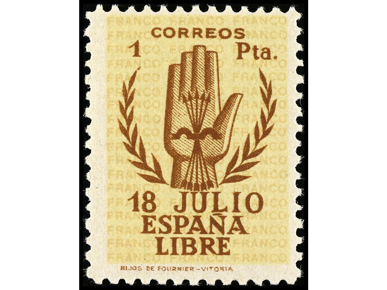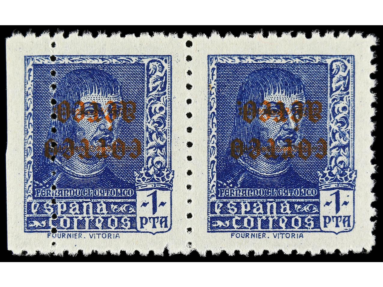 ESPAÑA. 1 pta. azul. HABILITACIÓN INVERTIDA. Pareja, un sello DENTADO VERTICAL MUY DESPLAZADO. RARA. Ed.846hi (2). (Image1)