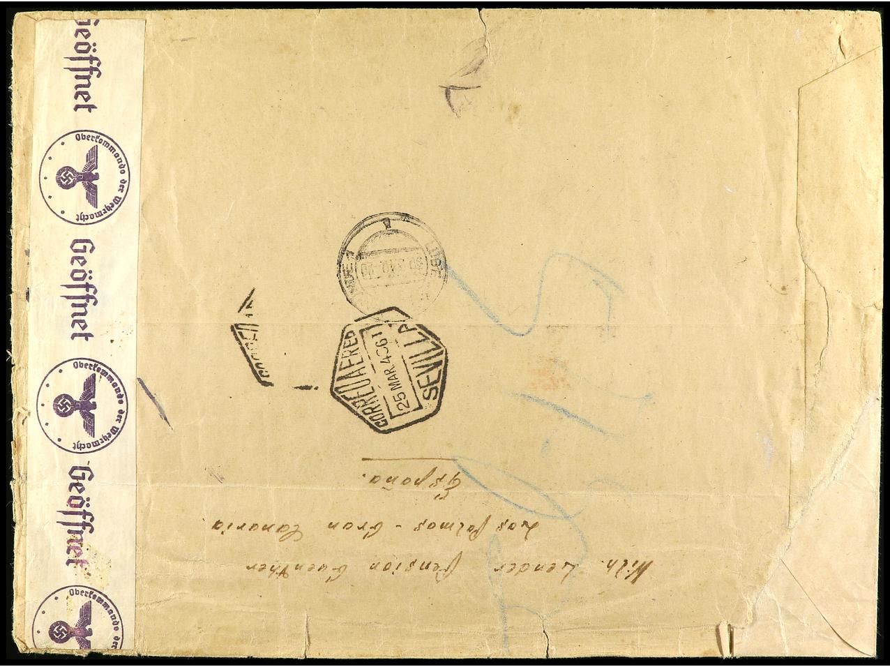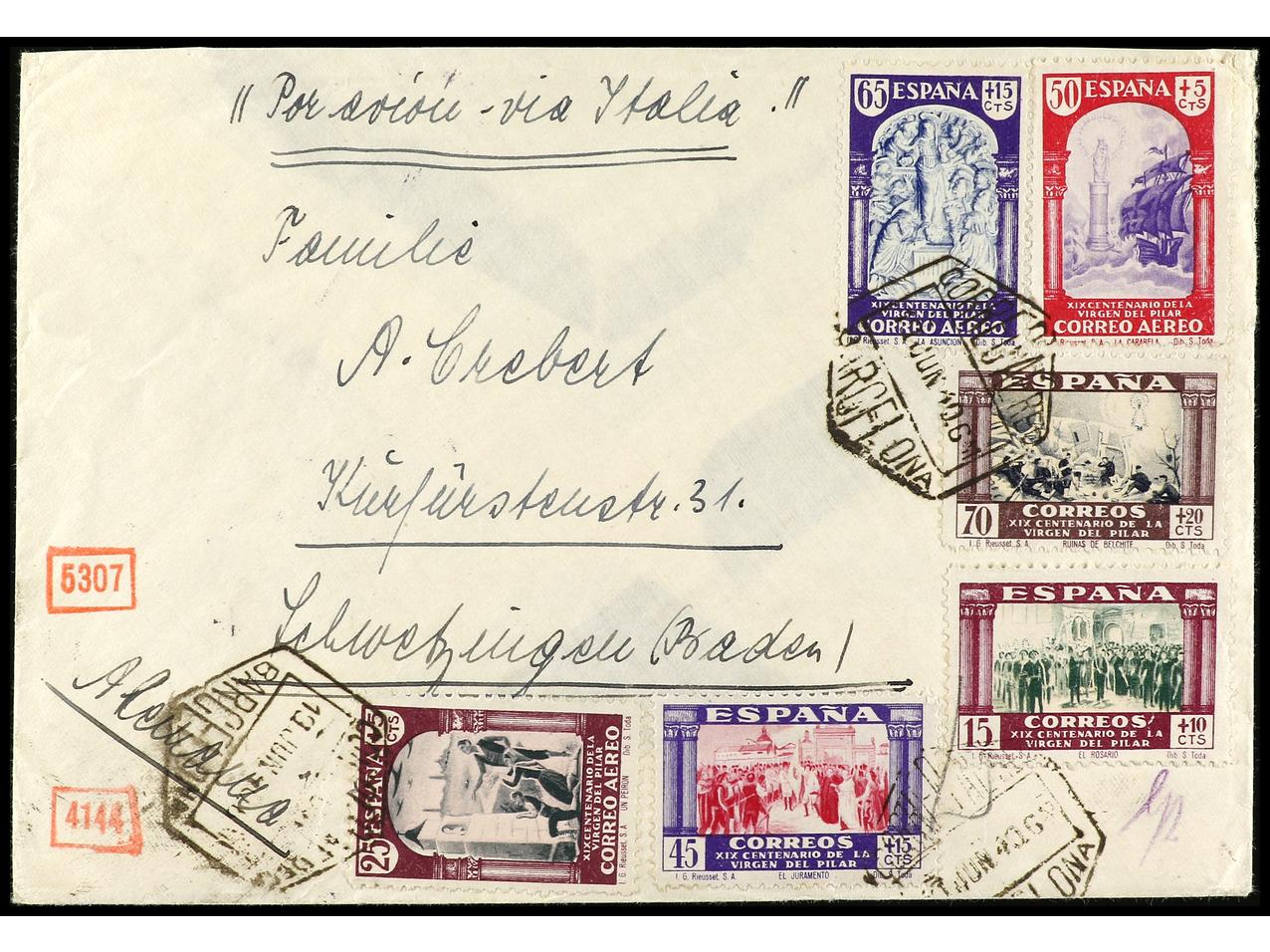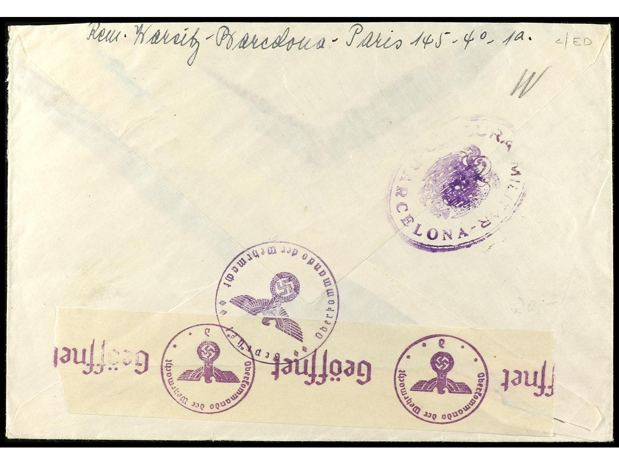 ESPAÑA. 1940. BARCELONA a ALEMANIA. 6 valores en carta circulada. Al dorso censura española y alemana. RARA. Ed.890, 894/5 y 904/07. (Image1) (Image2)