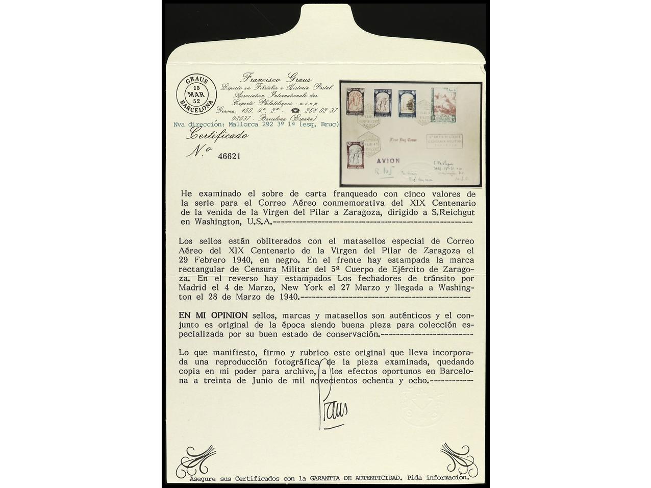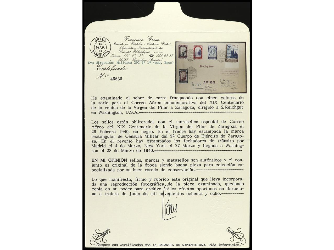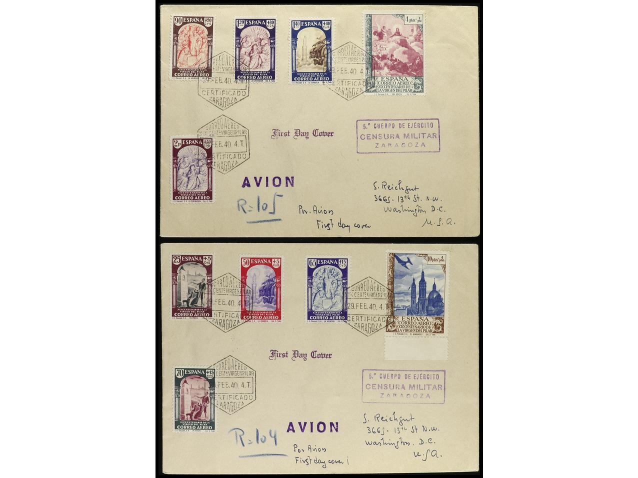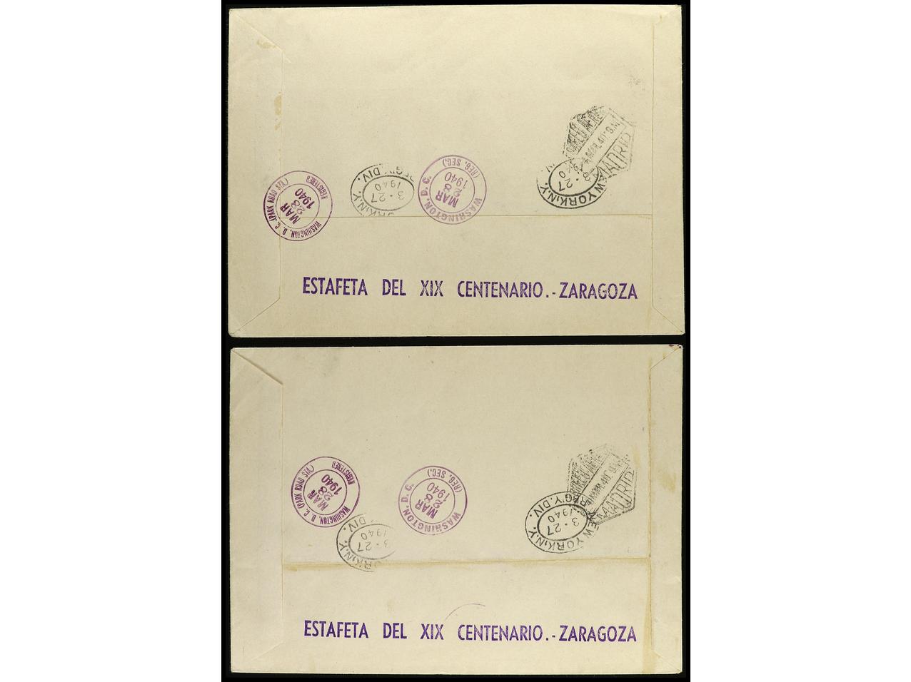 ESPAÑA. 1940 (29 febrero). ZARAGOZA a U.S.A. Serie completa en dos cartas circuladas. Al dorso tránsito y llegada. RARAS. Cert. GRAUS. Ed.904/13.