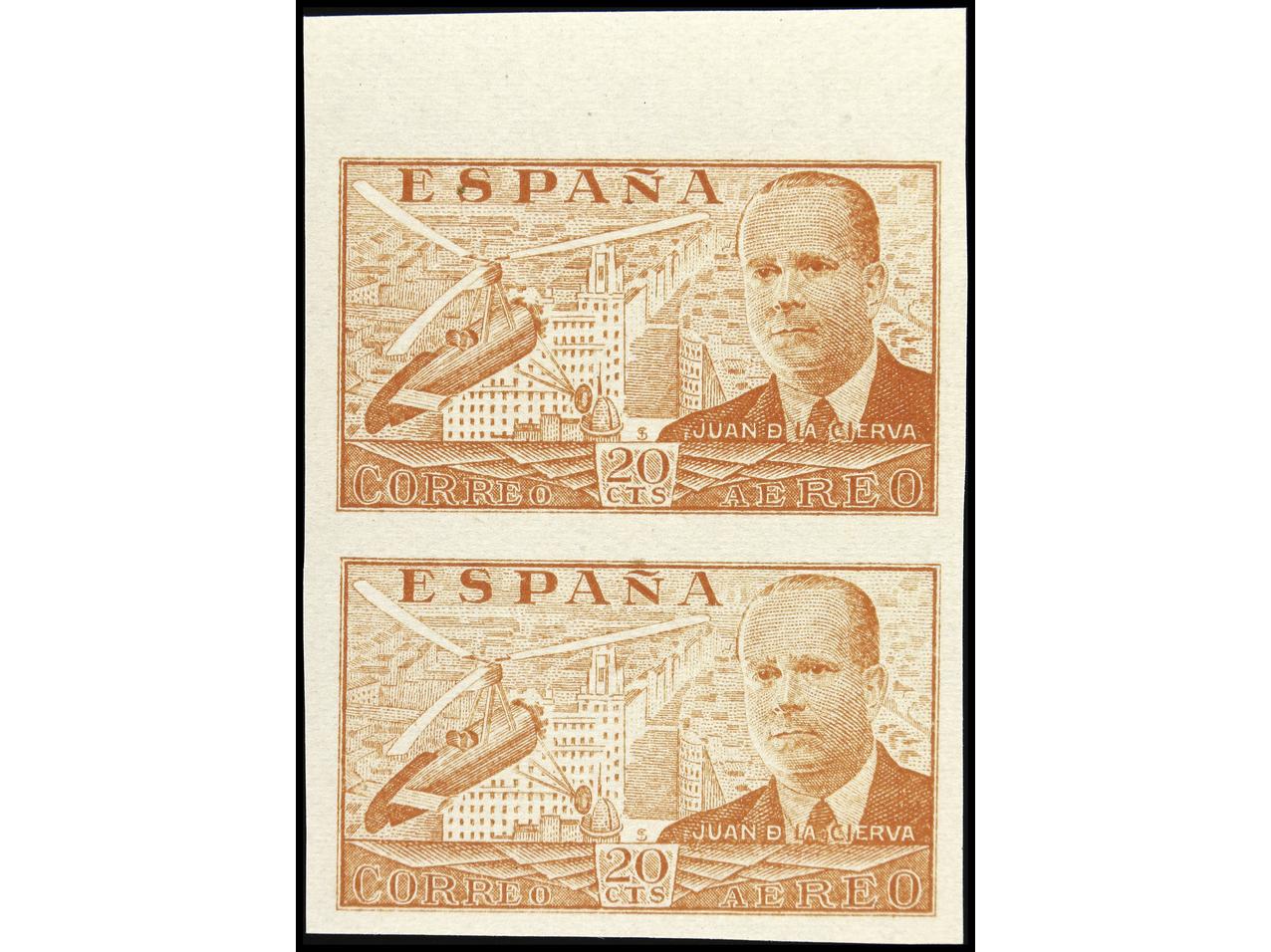 ESPAÑA. 20 cts. ocre COLOR CAMBIADO SIN DENTAR en pareja vertical. Ed.880ccs (2). Cat. +760€. (Image1)