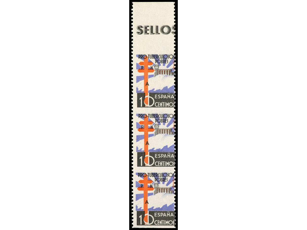 ESPAÑA. 10 cts. negro, azul y rojo. Tira de tres vertical SIN DENTADO HORIZONTAL y COLOR ROJO DESPLAZADO. RARO. Ed.866sh (3). Cat. +81€. (Image1)