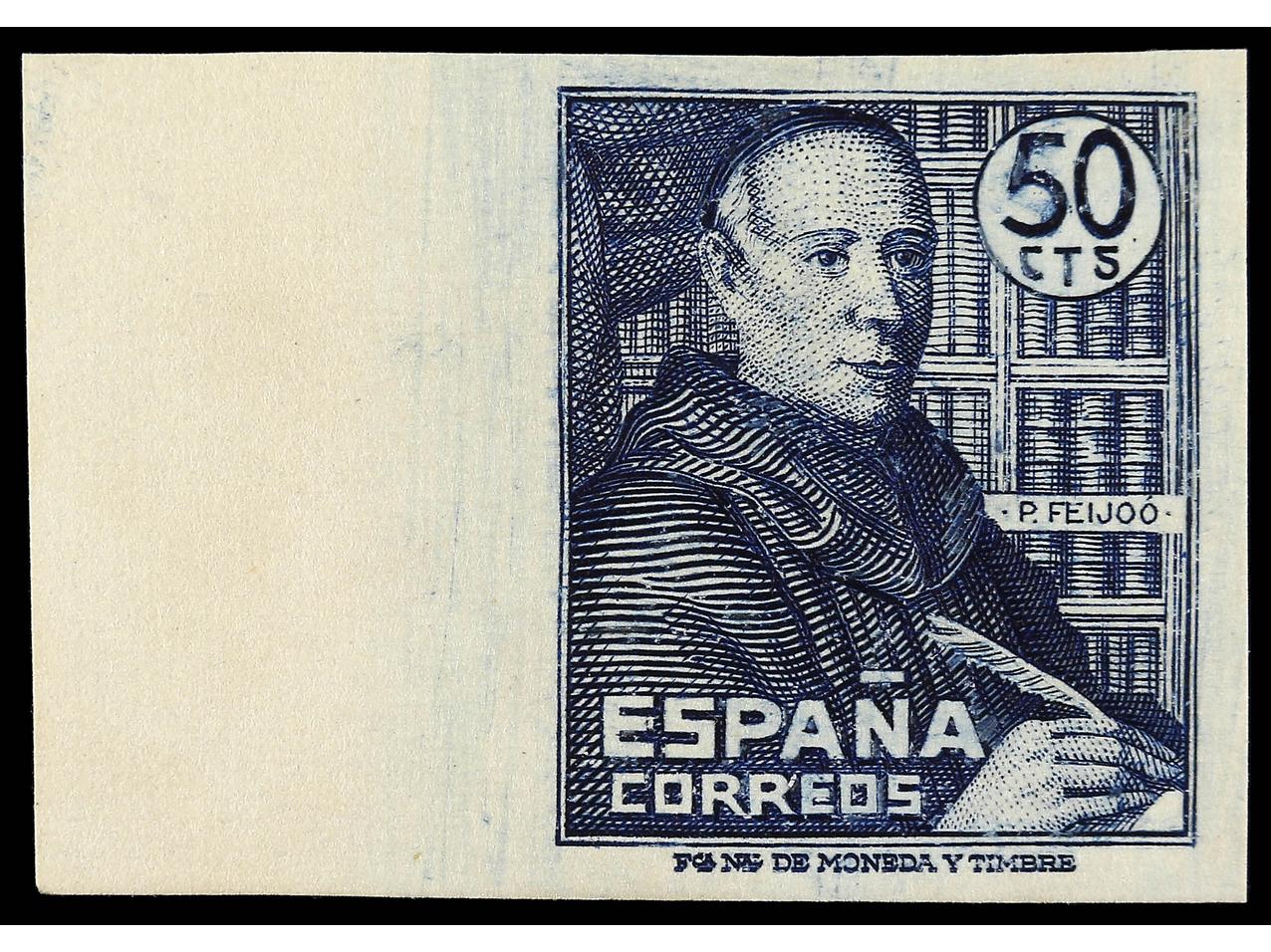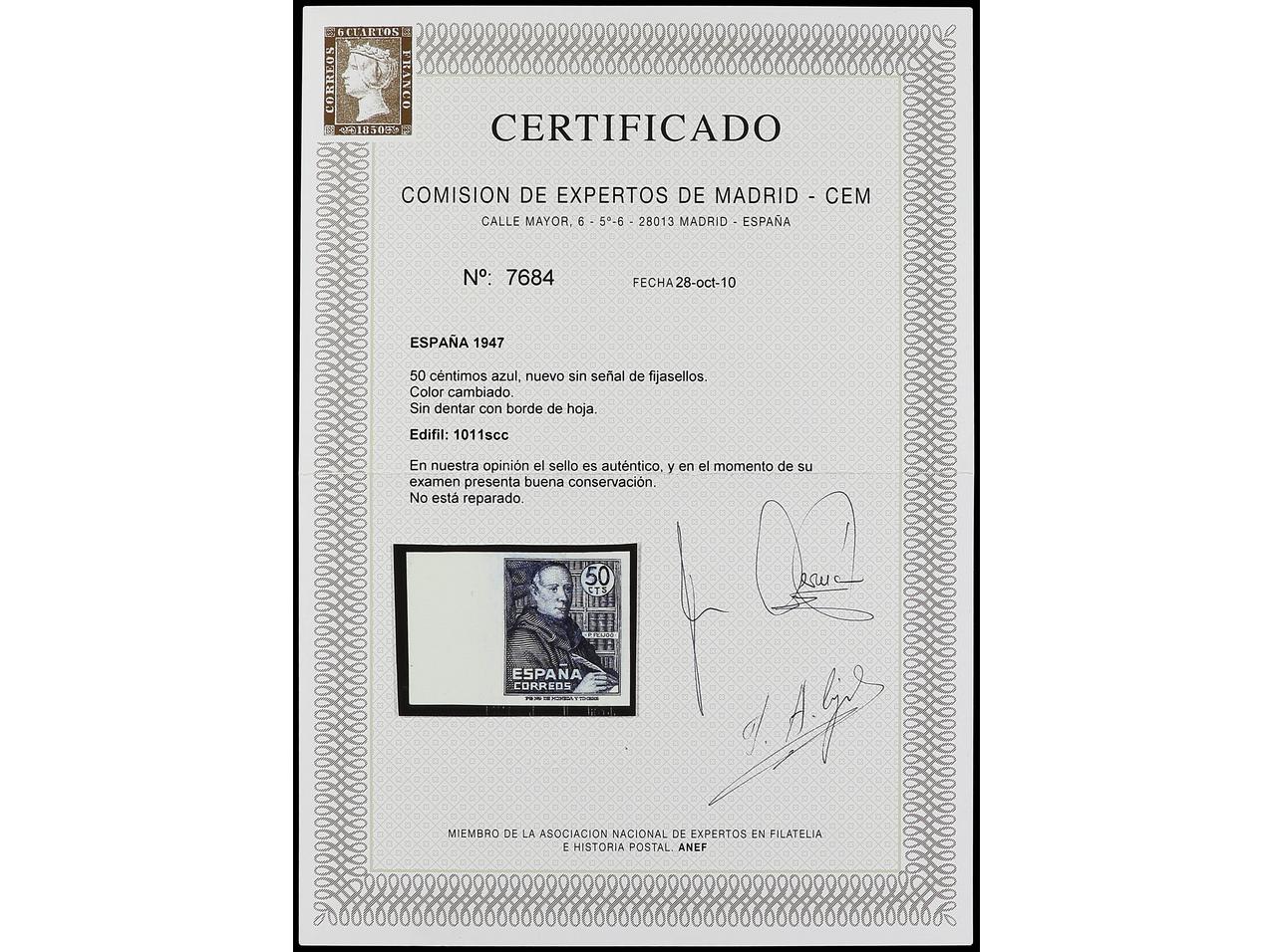 ESPAÑA. 50 cts. azul. ERROR DE COLOR SIN DENTAR. EXTRAORDINARIAMENTE RARO, muy pocos ejemplares conocidos. Cert. CEM. Ed.1011ccs. (Image1) (Image2)