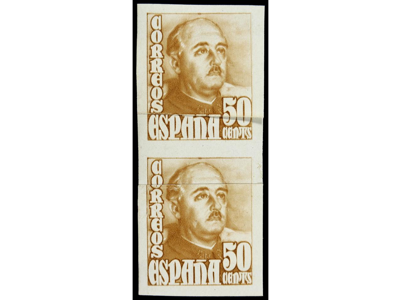 ESPAÑA. 50 cts. ocre. Pareja vertical SIN DENTAR y PAPEL EMPALMADO. RARÍSIMA variedad combinada. Ed.1022s (2). (Image1)