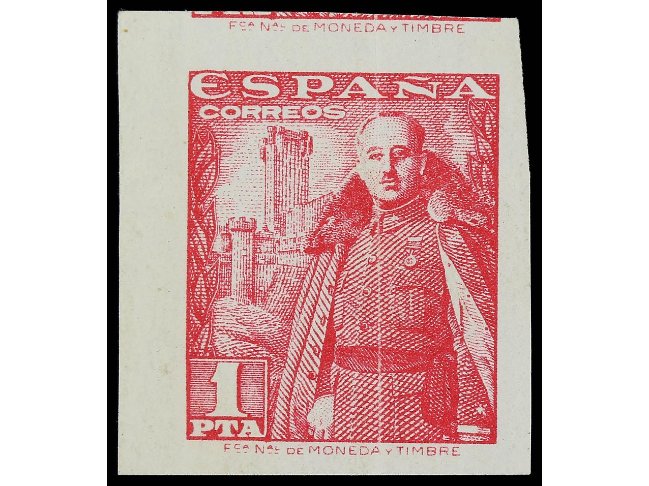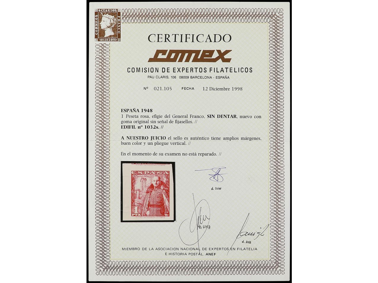 ESPAÑA. 1 pta. rosa SIN DENTAR. Amplios márgenes. MUY RARO. Pliegue vertical. Cert. COMEX. Ed.1032s. (Image1) (Image2)