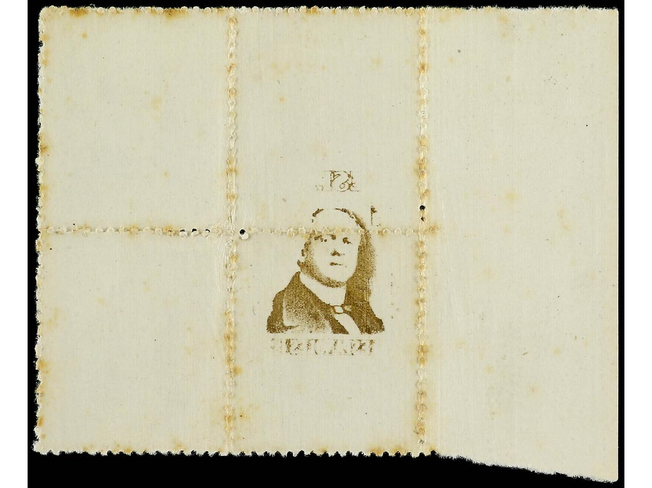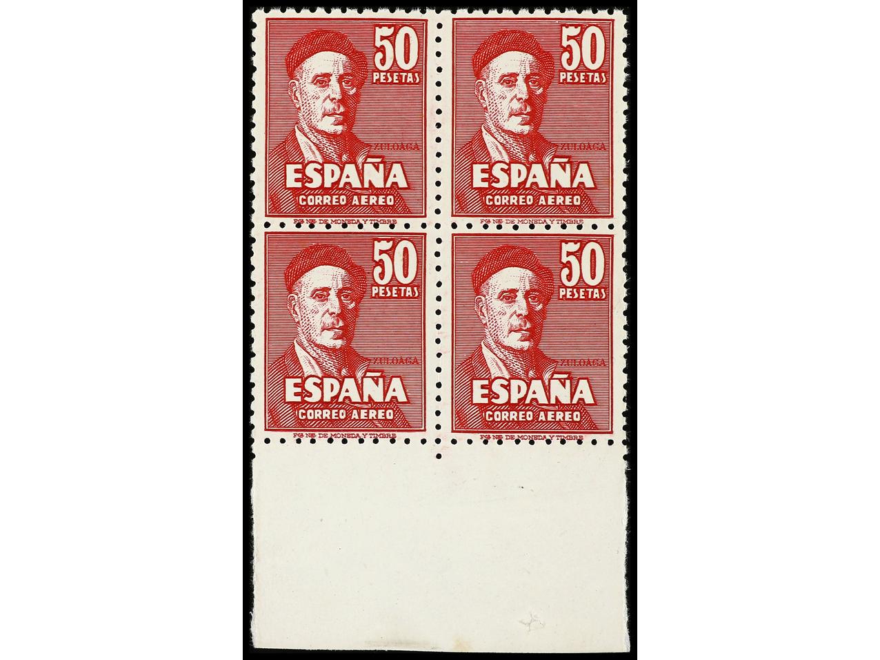 ESPAÑA. 50 cts. castaño. Bloque de 4 PARCIALMENTE IMPRESO AL DORSO EN ESPEJO. Sombras del tiempo. RARO. Ed.1037. (Image1)