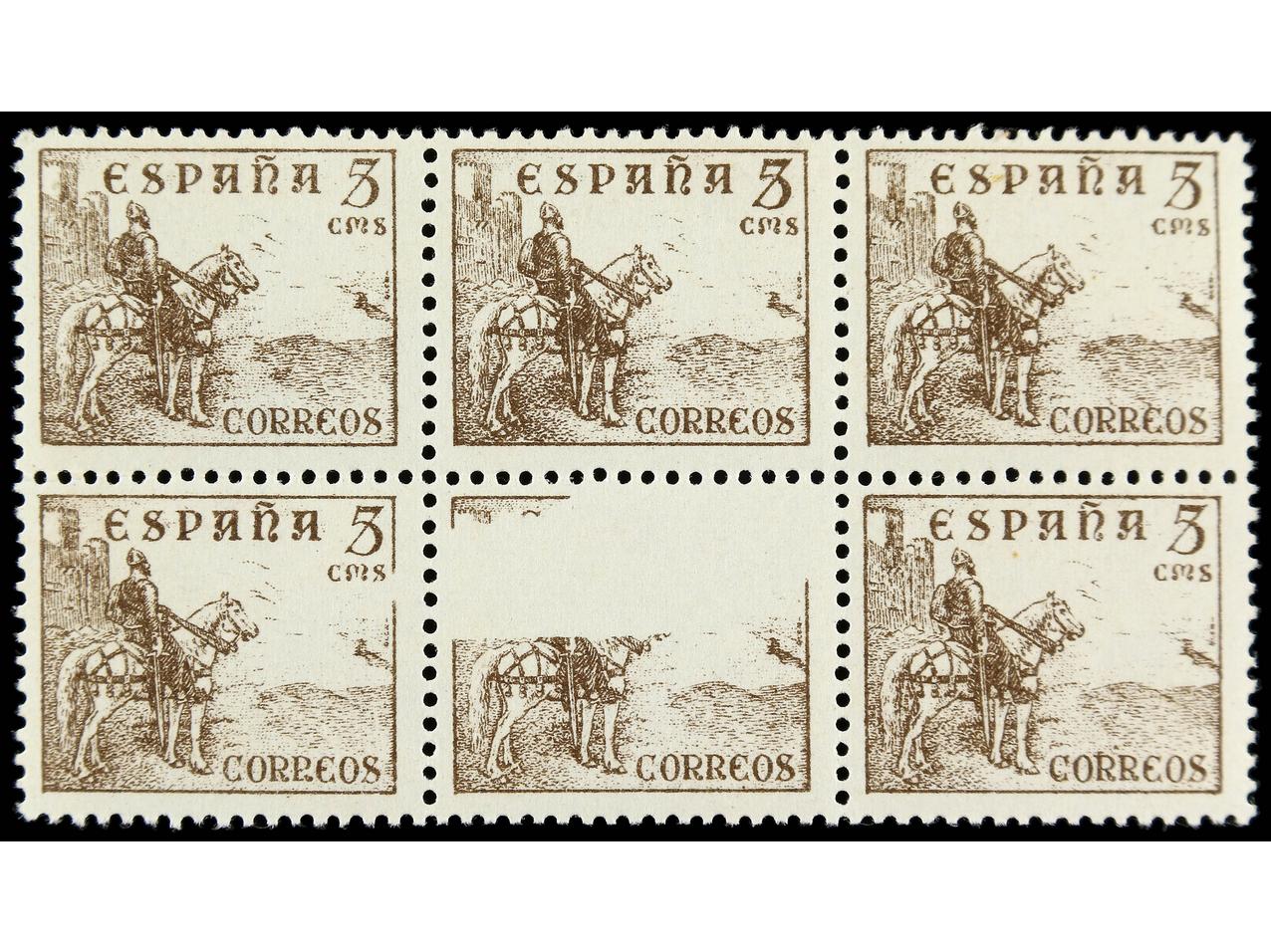 ESPAÑA. 5 cts. castaño. Bloque de 6 VARIEDAD DE IMPRESIÓN. Ed.1044 (6). (Image1)