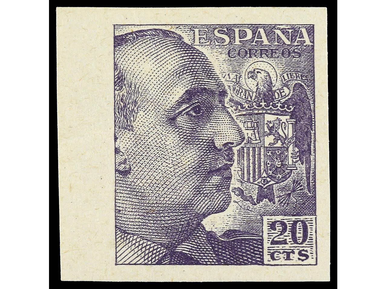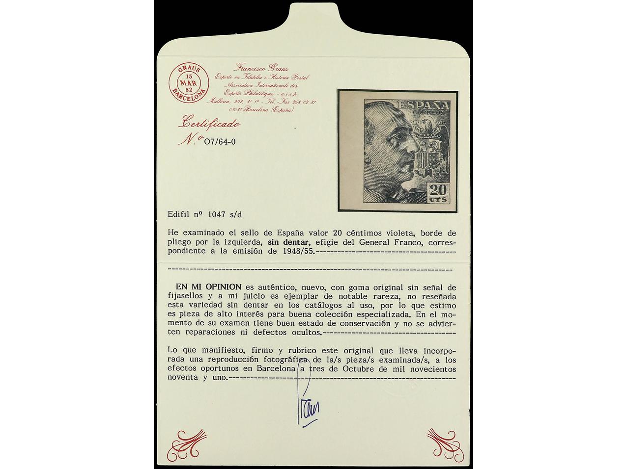 ESPAÑA. 20 cts. violeta. Borde de hoja SIN DENTAR. MUY RARO. Cert. GRAUS. Ed.1047s. (Image1) (Image2)