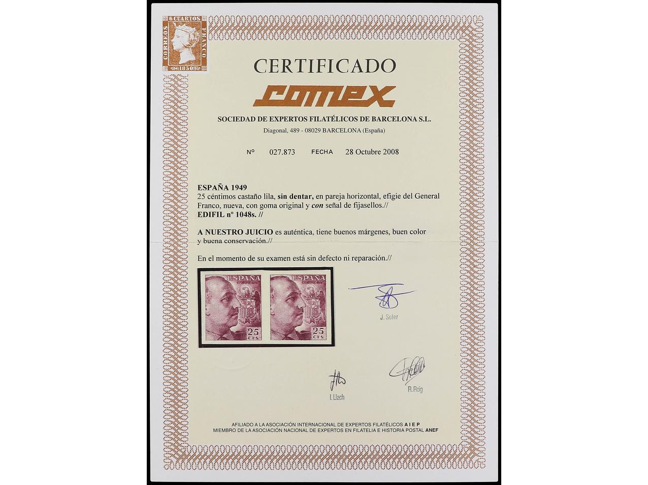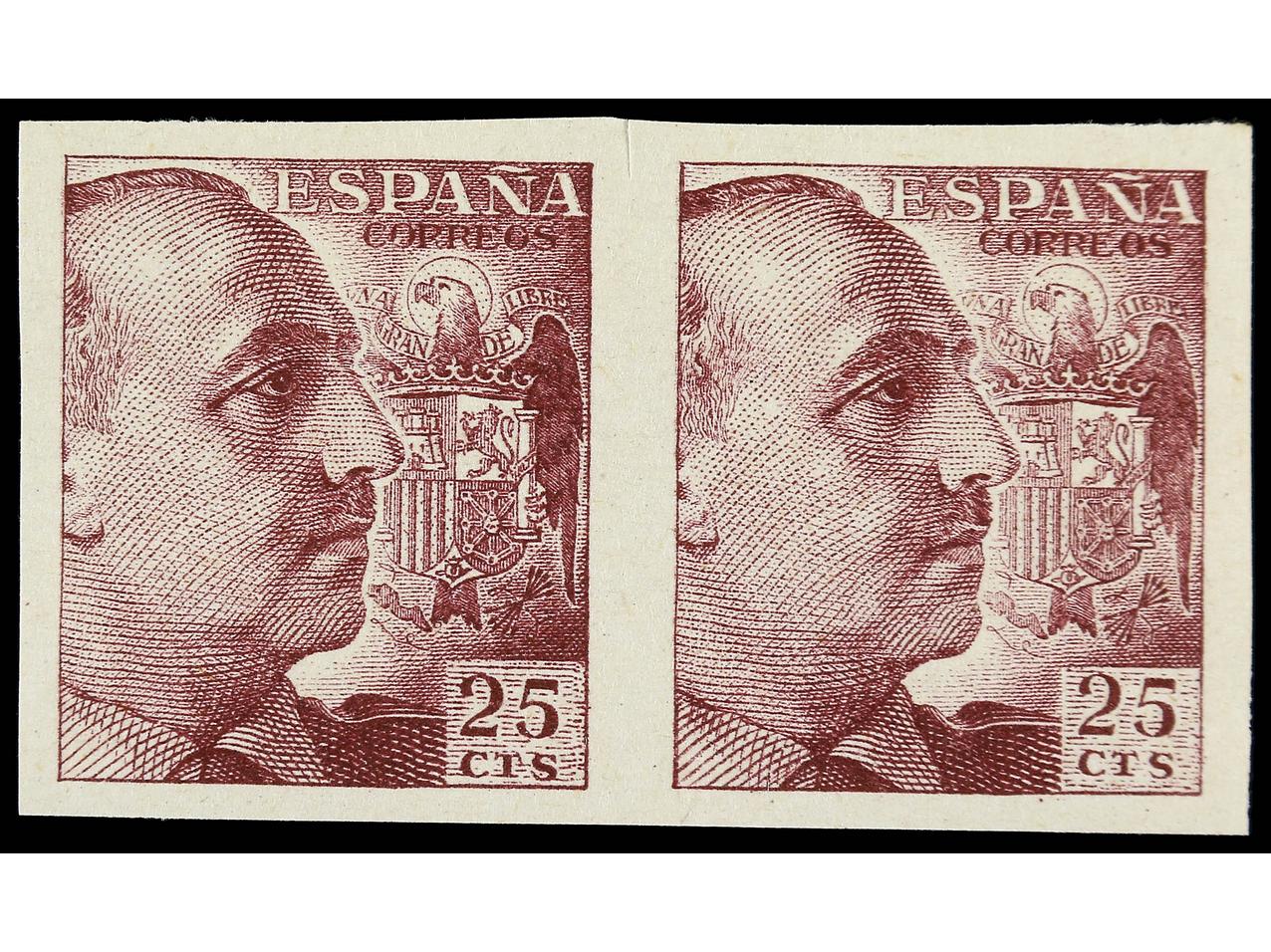 ESPAÑA. 25 cts. castaño lila. Pareja SIN DENTAR y CALCADO AL DORSO. RARO. Un sello sin fijasellos. Cert. COMEX. Ed.1048s (2). (Image1) (Image2)