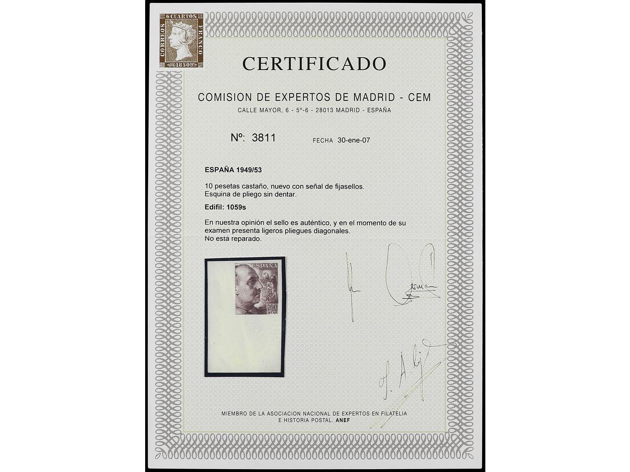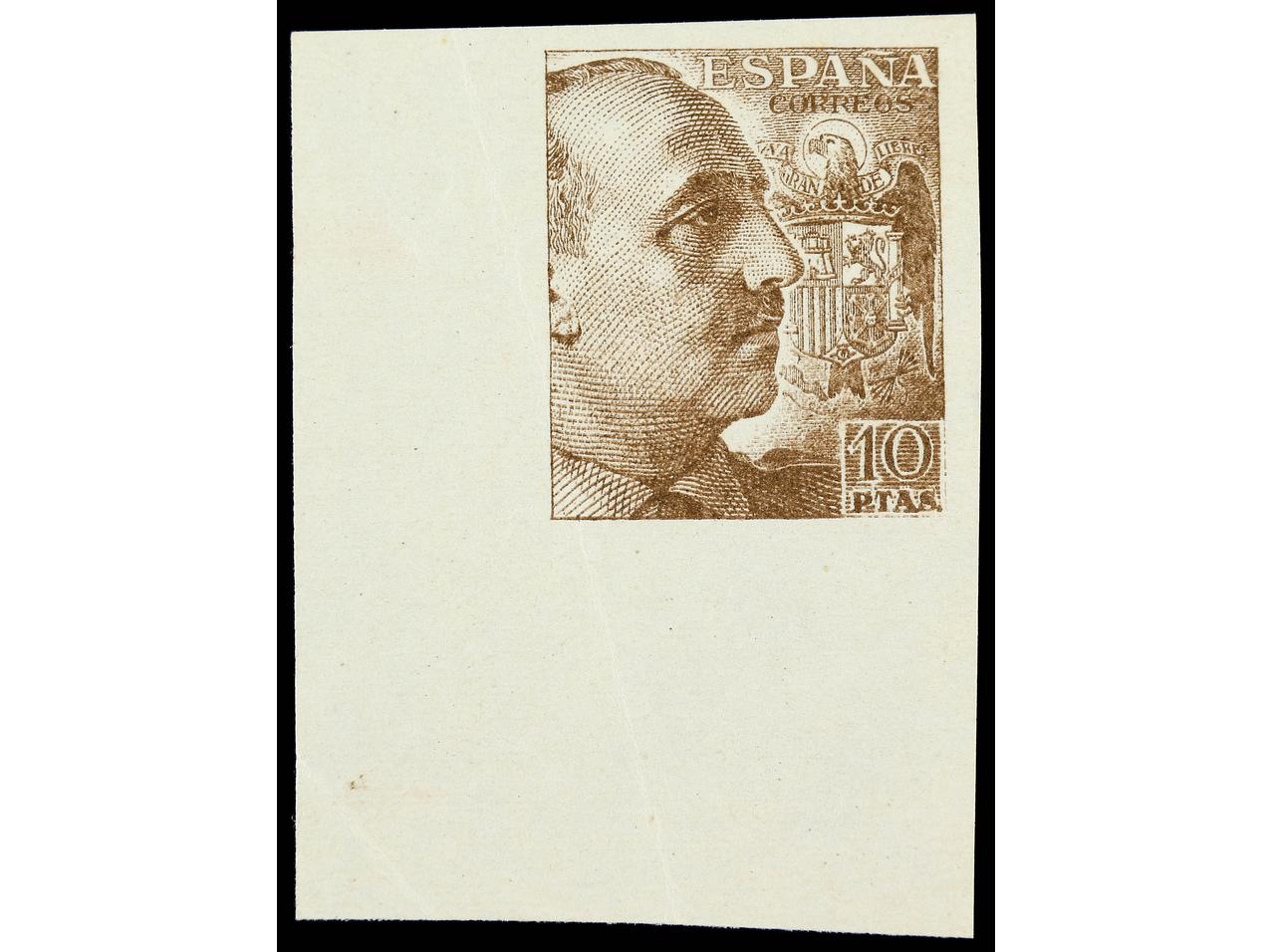 ESPAÑA. 10 pts. castaño. Esquina de hoja SIN DENTAR. Ligeros pliegues diagonales. MUY RARO. Cert. CEM. Ed.1059s. (Image1) (Image2)