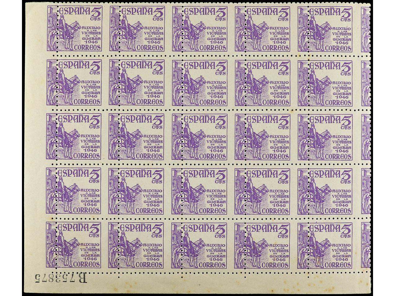ESPAÑA. 5 cts. violeta. Bloque de 25 DENTADO VERTICAL DESPLAZADO. Sombras del tiempo. Ed.1062dv (25). Cat. +312€. (Image1)