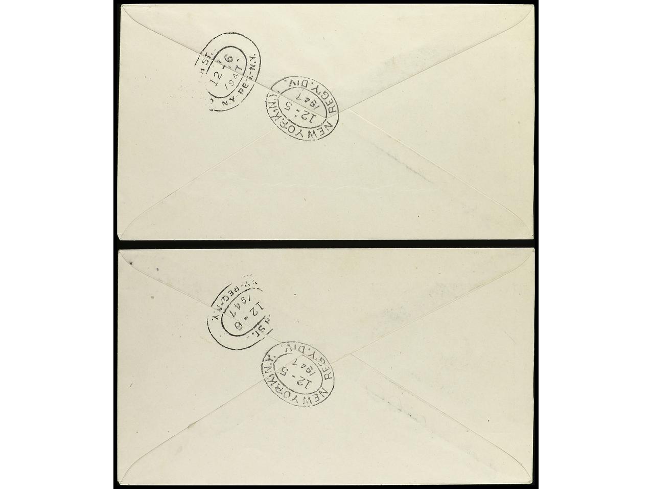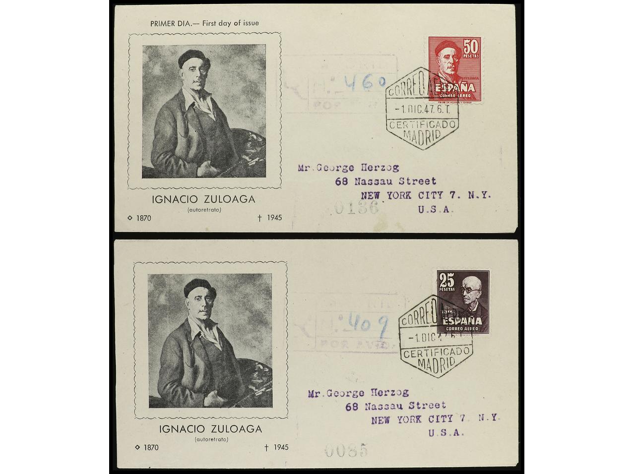 ESPAÑA. 1947 (1 diciembre). SERIE COMPLETA en 2 cartas de MADRID a U.S.A. con mat. PRIMER DÍA DE EMISIÓN. PRECIOSAS y MUY RARAS. Ed.1015/16. Cat. 415€.
