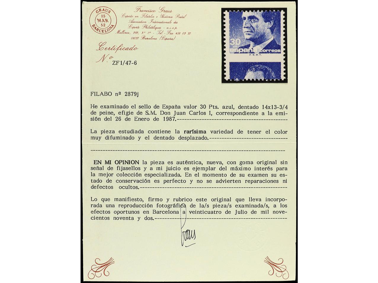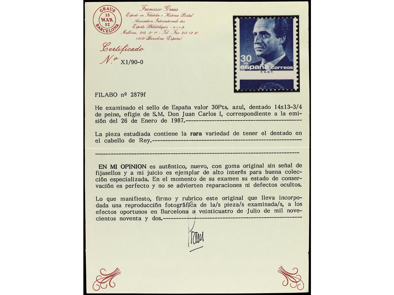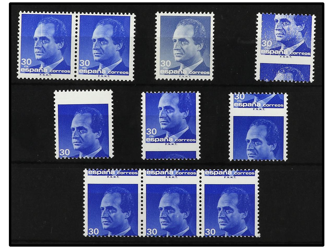 ESPAÑA. JUAN CARLOS I. 30 cts. azul. 9 ejemplares con distintas VARIEDADES DE DENTADO o IMPRESIÓN. Varios con cert. GRAUS. Ed.2879 (9). (Image1) (Image2)