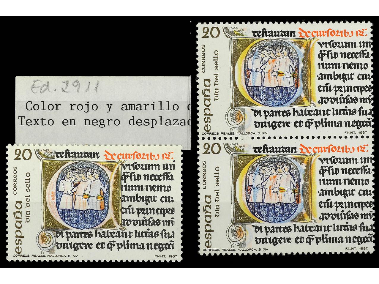 ESPAÑA. DÍA DEL SELLO´87. 20 pts. multicolor. Pareja vertical, COLORES DESPLAZADOS. Ed.2911. (Image1) (Image2)