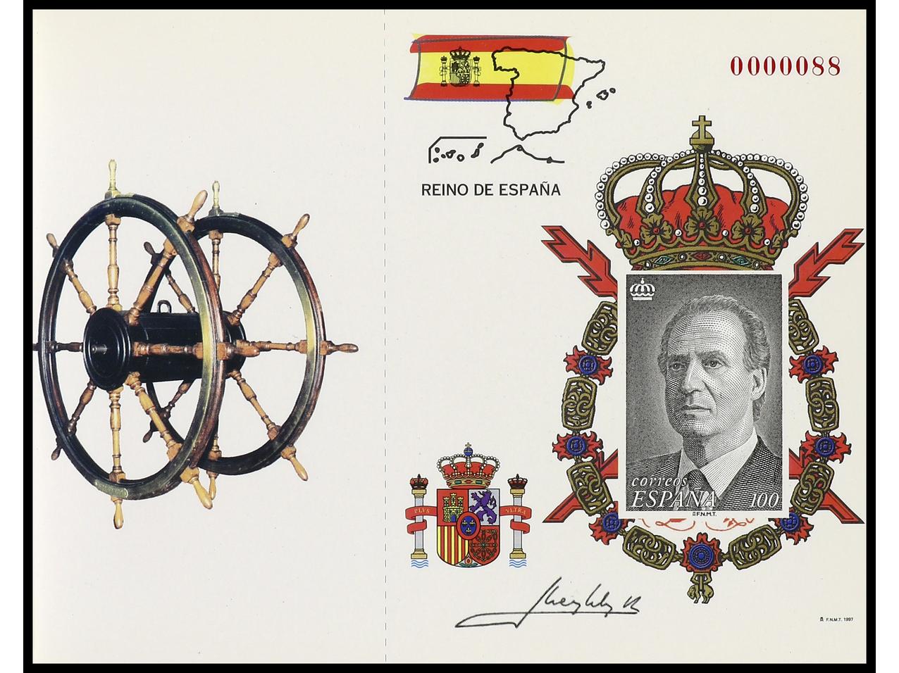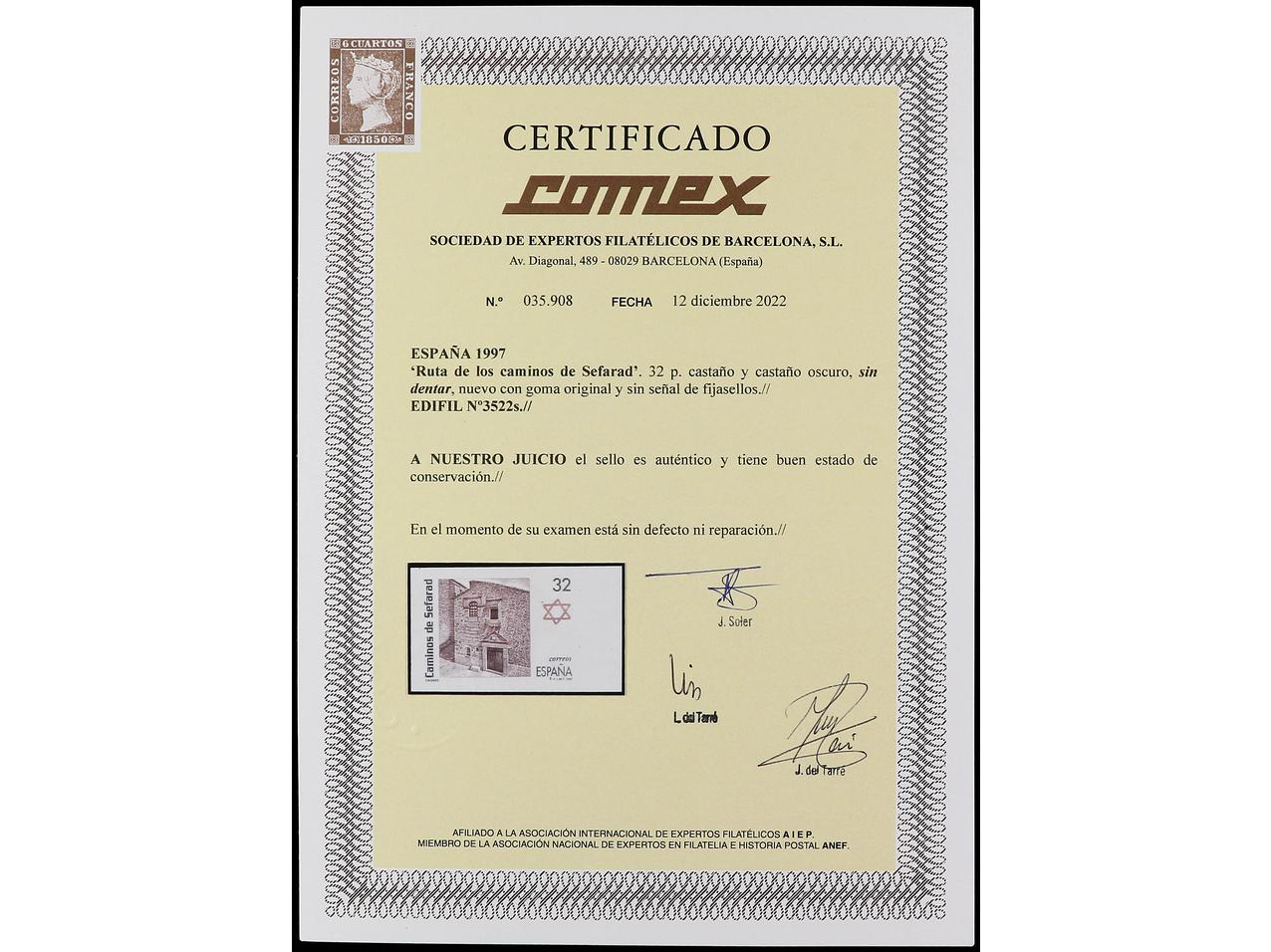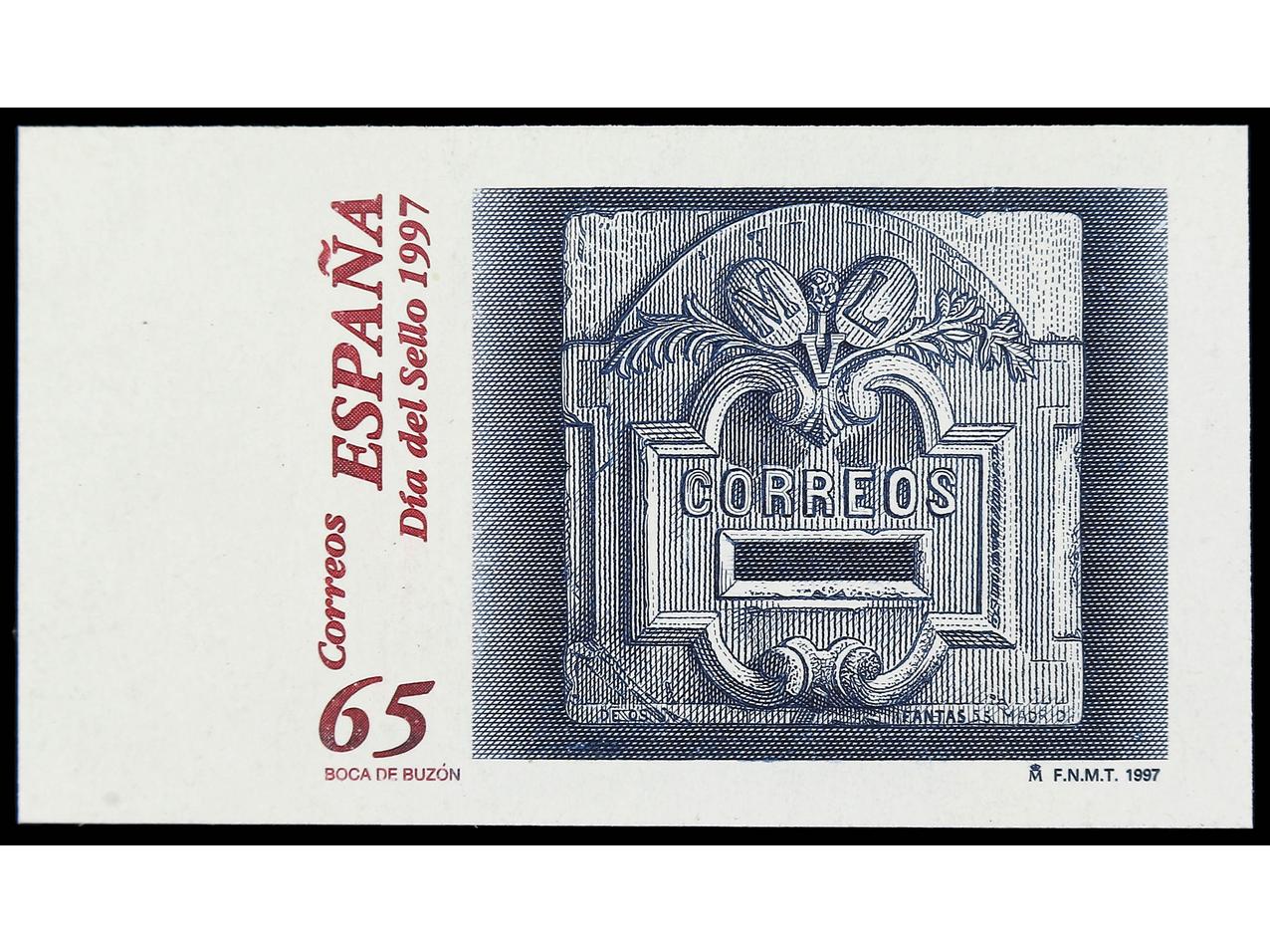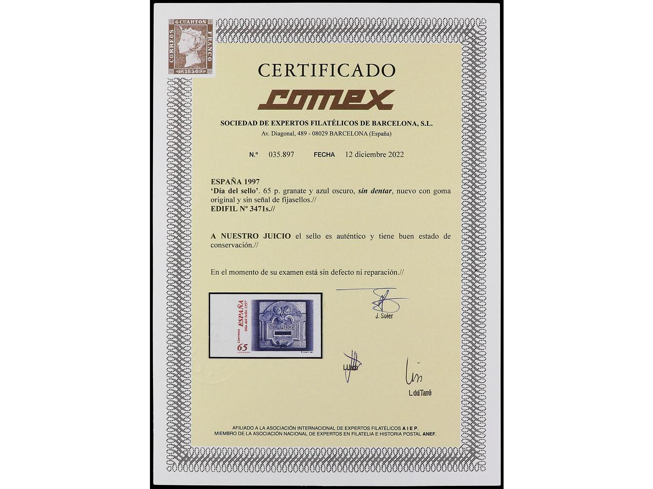 ESPAÑA. DIA DEL SELLO 1997. 65 pts. granate y azul oscuro. SIN DENTAR. RARÍSIMO. Cert. COMEX. Ed.3471s. (Image1) (Image2)