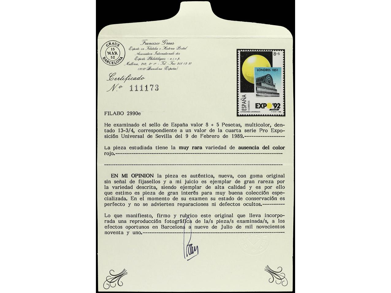 ESPAÑA. EXPO´92. 8 + 5 pts. multicolor FALTA EL COLOR ROJO. Cert. GRAUS. Ed.2990. (Image1) (Image2)