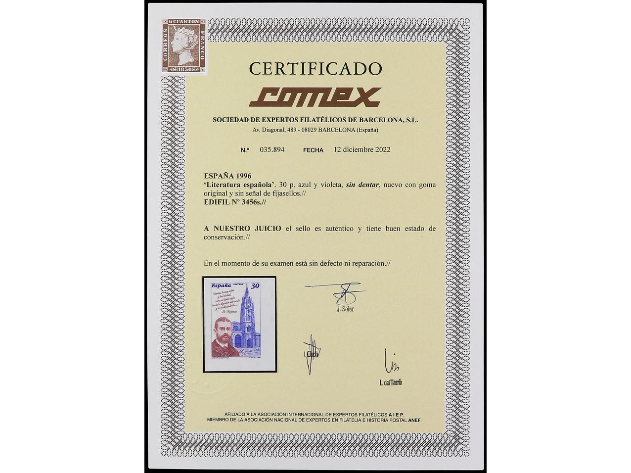 ESPAÑA. LITERATURA ESPAÑOLA. 30 pts. azul y violeta. SIN DENTAR. RARÍSIMO. Cert. COMEX. Ed.3456s. (Image1) (Image2)