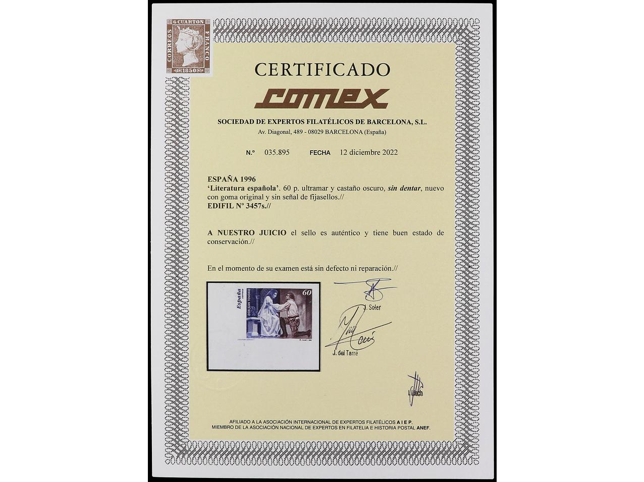 ESPAÑA. LITERATURA ESPAÑOLA. 60 pts. ultramar y castaño oscuro. SIN DENTAR. RARÍSIMO. Cert. COMEX. Ed.3457s. (Image1) (Image2)