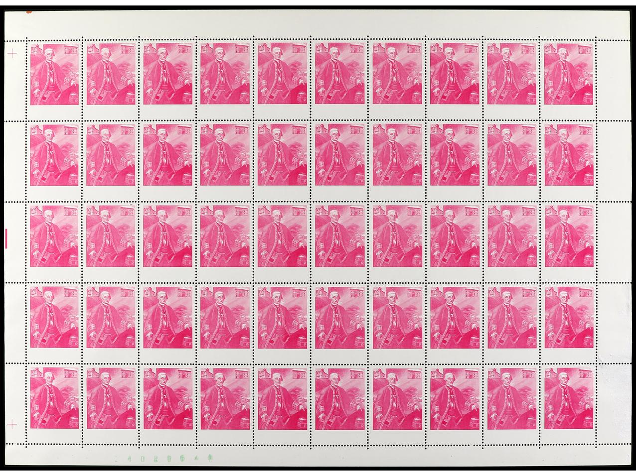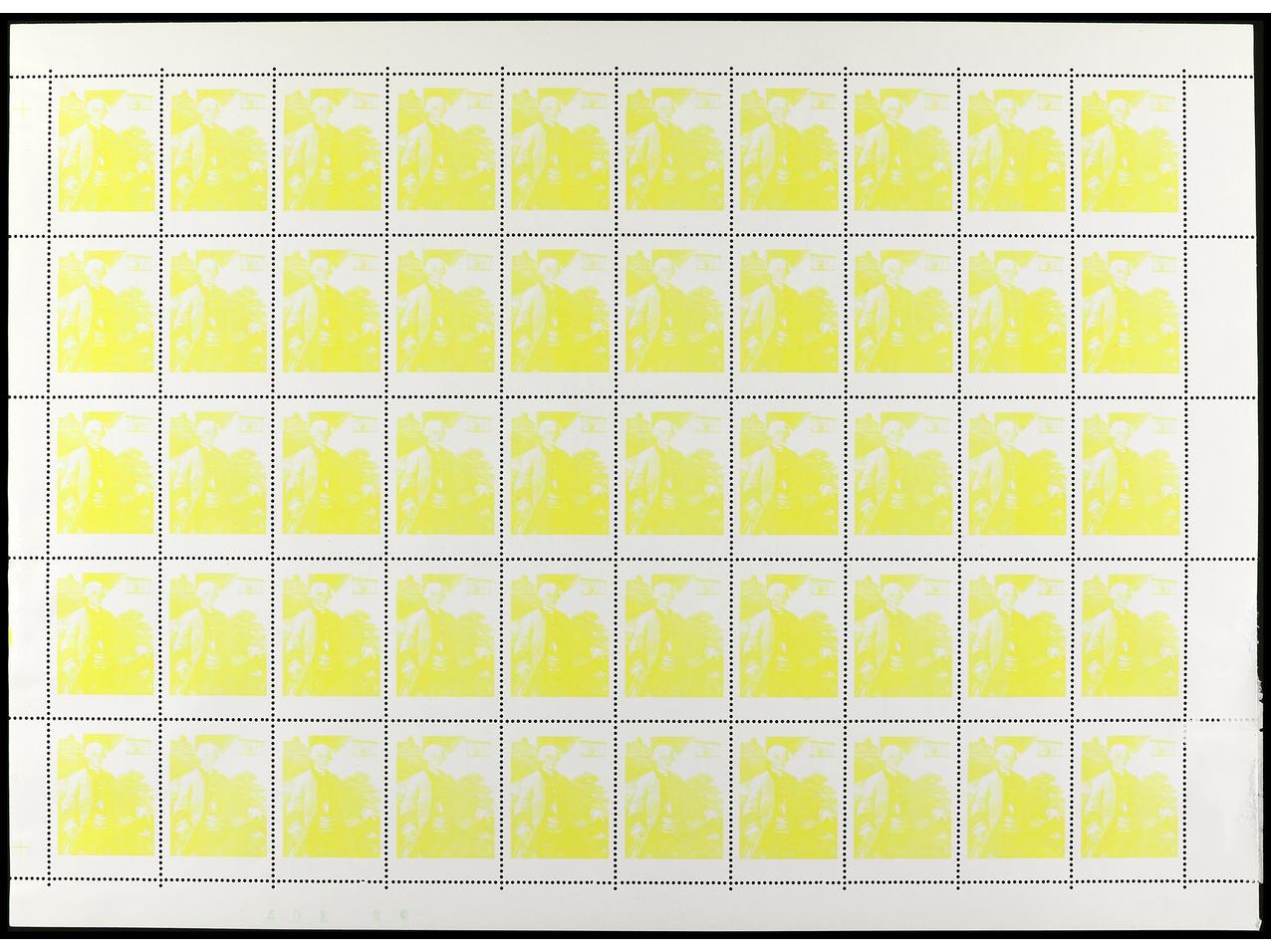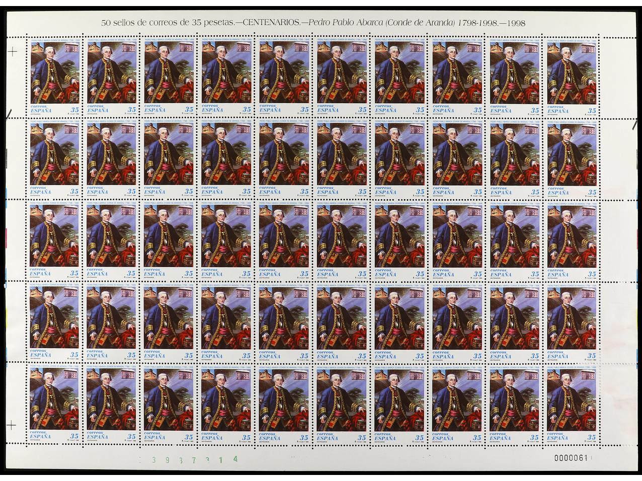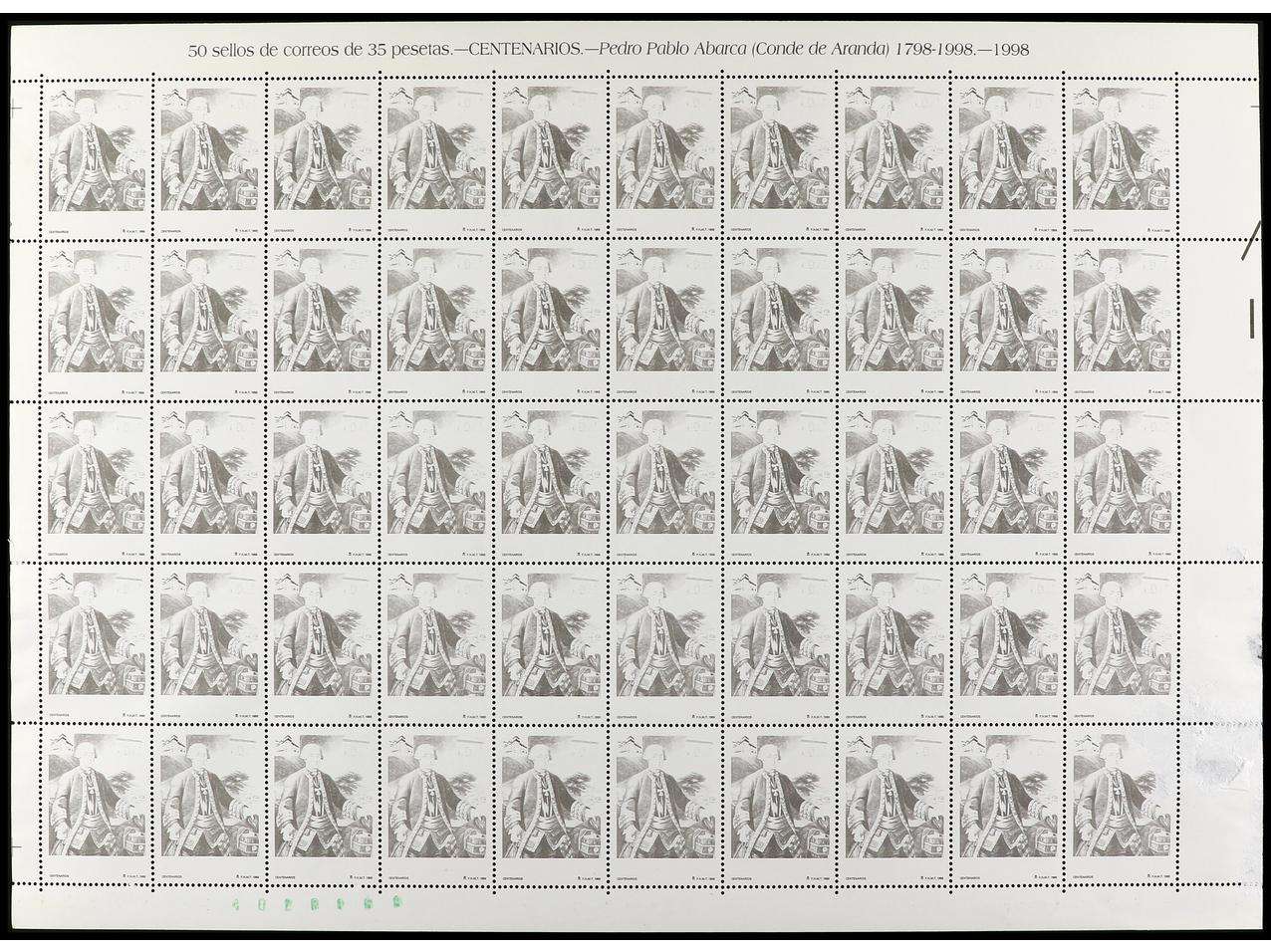ESPAÑA. CENTENARIOS. CONDE DE ARANDA. Pruebas de color de la imprenta con el desglose de los cuatro colores de la impresión, negro, magenta, amarillo y azul en hoja completa de 50 sellos. Sobre el papel original de la impresión y