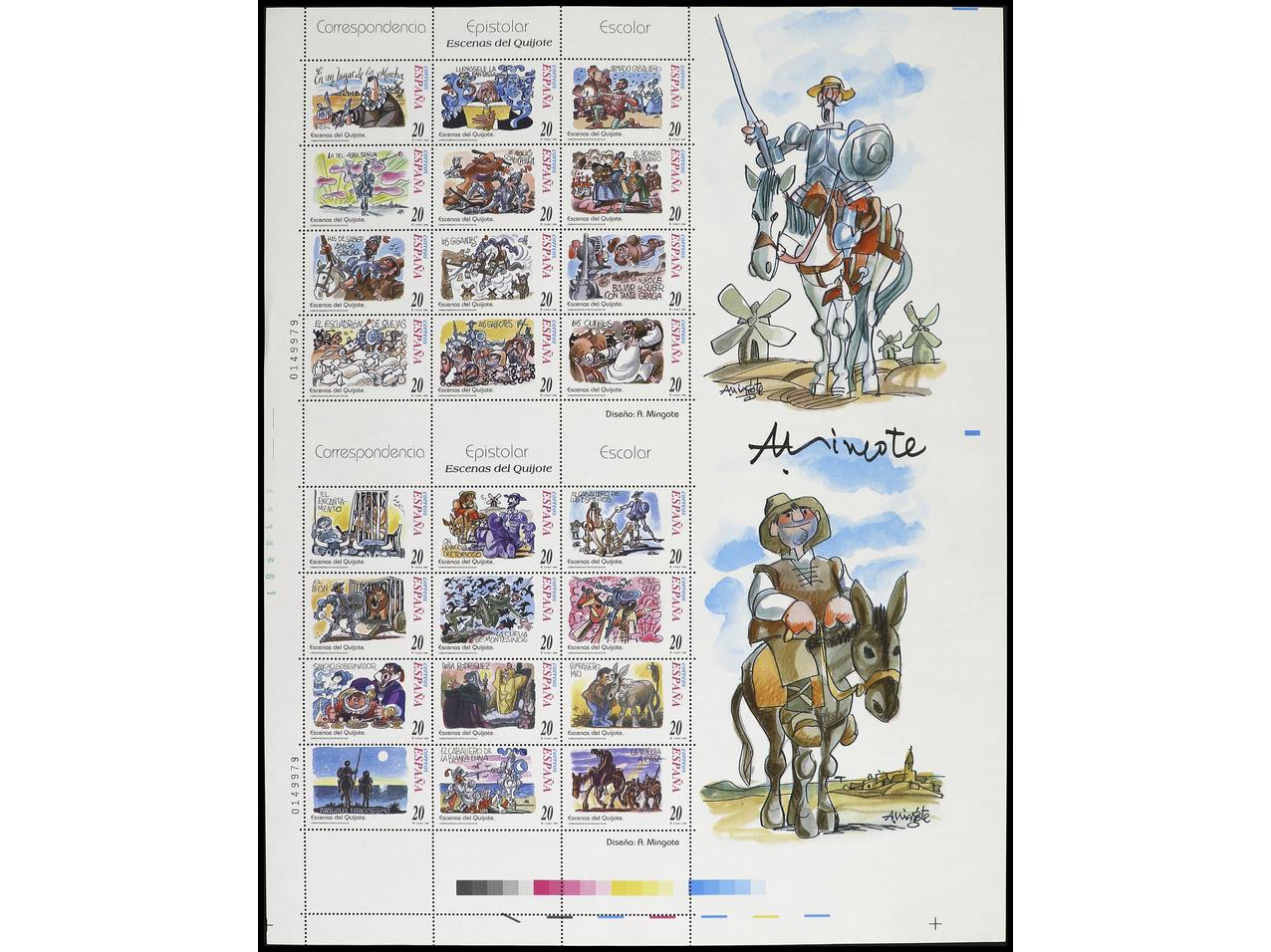 ESPAÑA. ESCENAS DEL QUIJOTE. Los dos minipliegos en pareja vertical sin cortar. Firma autógrafa del dibujante MINGOTE. Ed.3560/83. (Image1)