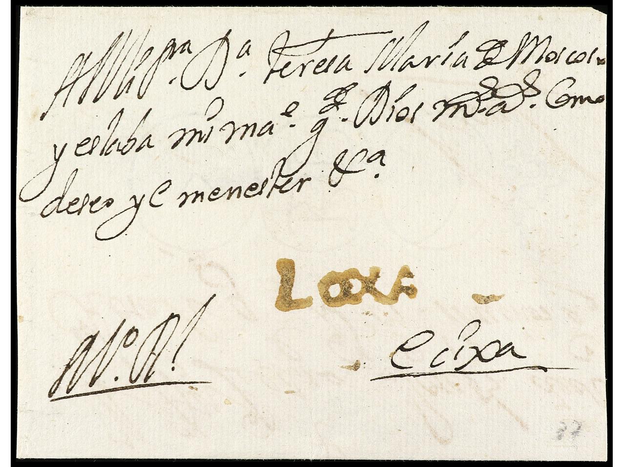 ESPAÑA: PREFILATELIA. 1760 ca. LOJA. Envuelta circulada a ECIJA. Marca en tinta de escribir LOXA. RARÍSIMA (ext.). (Image1) (Image2)