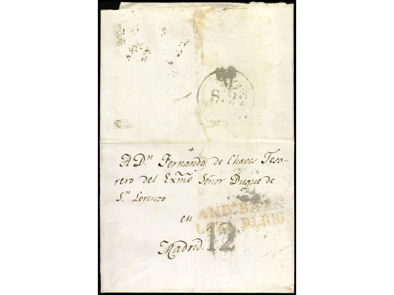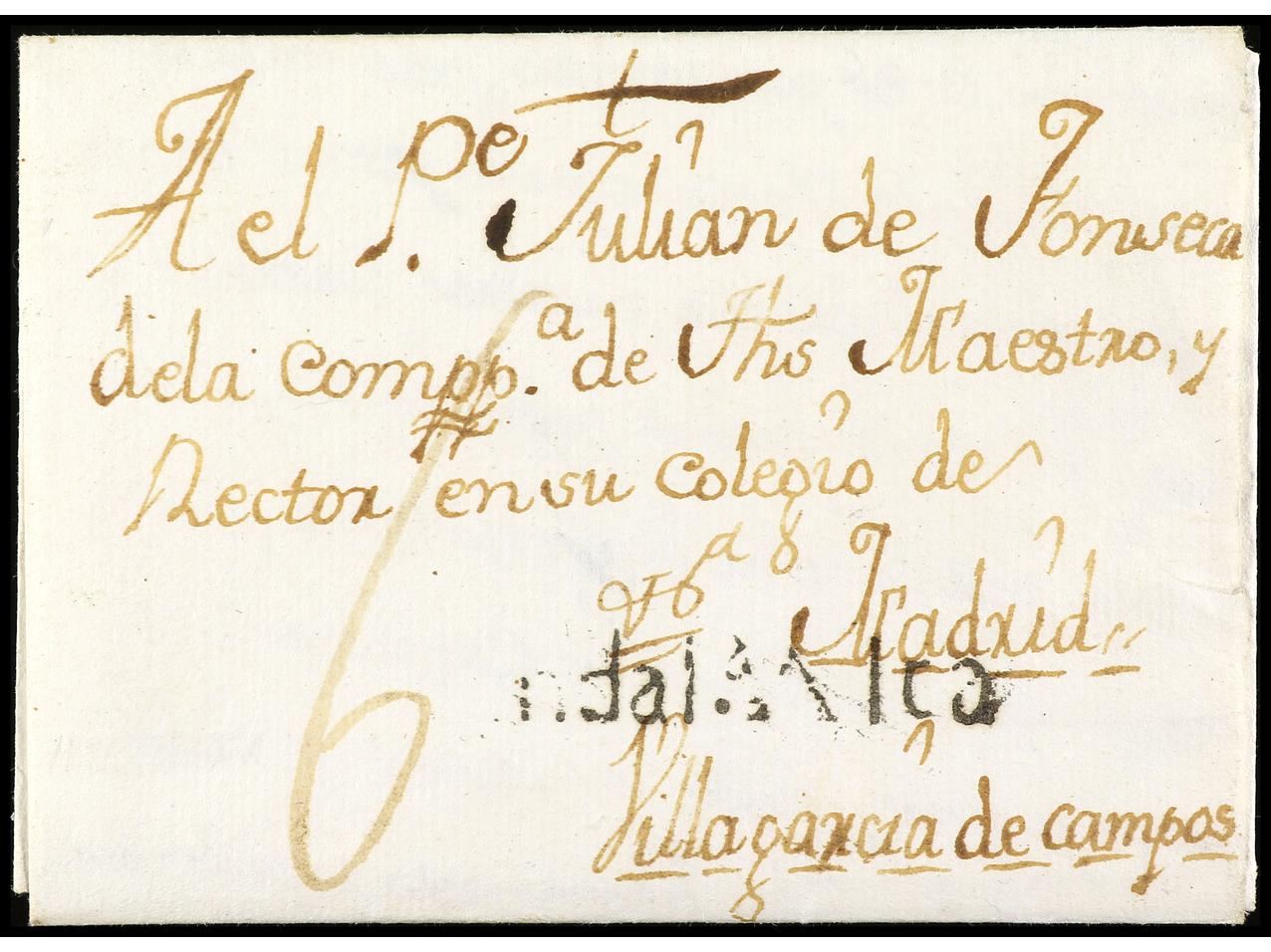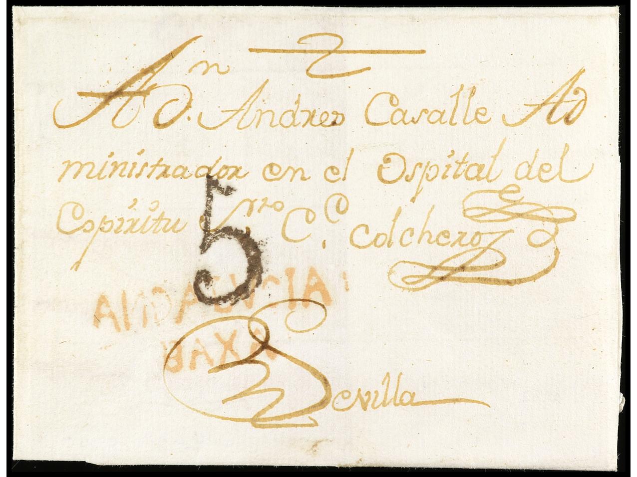 ESPAÑA: PREFILATELIA. 1763. MARCHENA. Sobrescrito a VILLAGARCIA DE CAMPOS (Valladolid). Marca en negro ANDALAALTA (P.E. 1). PRECIOSA y MUY RARA.
