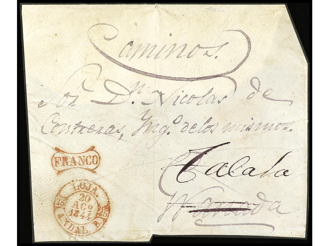 ESPAÑA: PREFILATELIA. 1844. LOJA. Frontal a TALARA (Granada). Fechador LOJA y marca FRANCO (P.E. 7) en rojo. PRECIOSO y RARO. (Image1)