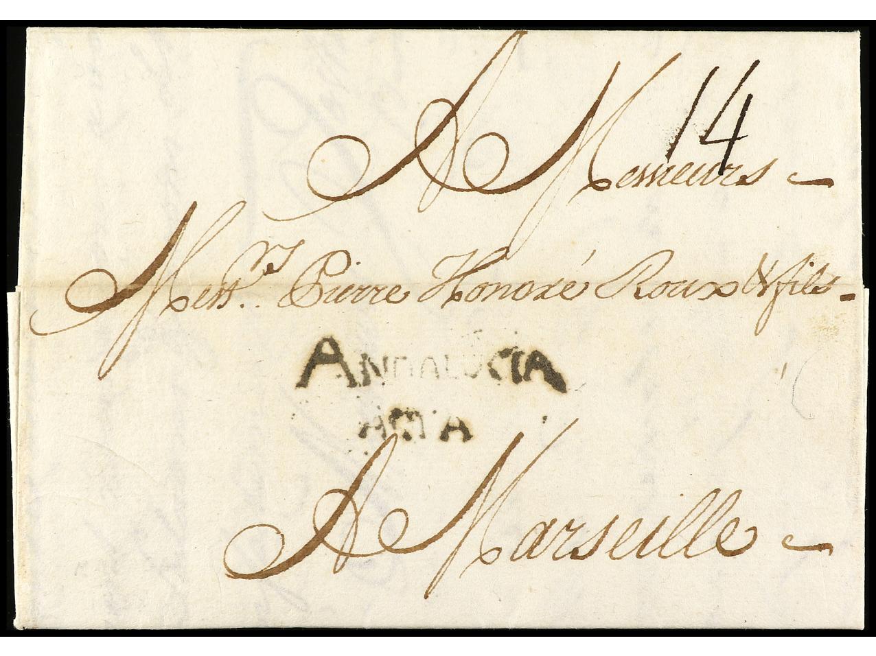 ESPAÑA: PREFILATELIA. 1769. MÁLAGA. Sobrescrito a MARSELLA. Marca ANDALUCIA/ALTA (P.E. 5) en negro. (Image1) (Image2)