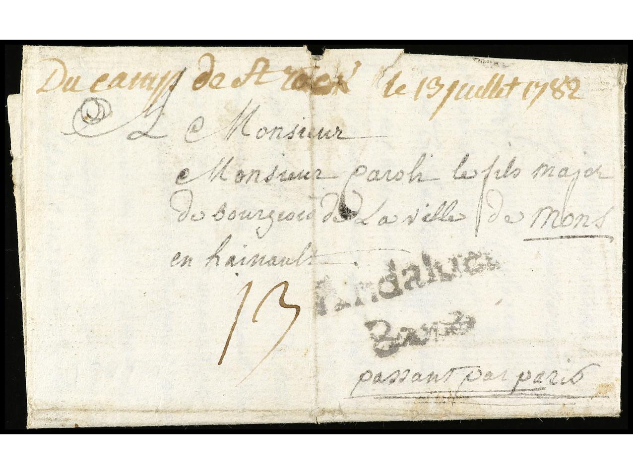 ESPAÑA: PREFILATELIA. 1782. MÁLAGA. SAN ROQUE a MONS (Bélgica). Marca en tránsito de Málaga, ANDALUCIA/BAXA (P.E. 6) en negro. (Image1) (Image2)