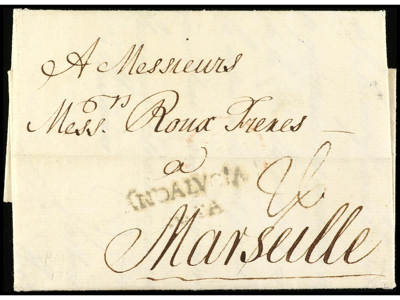 ESPAÑA: PREFILATELIA. 1758. MÁLAGA. Sobrescrito a MARSELLA. Marca en negro ANDALUCIA/ALTA (P.E.3). PRECIOSA. (Image1) (Image2)