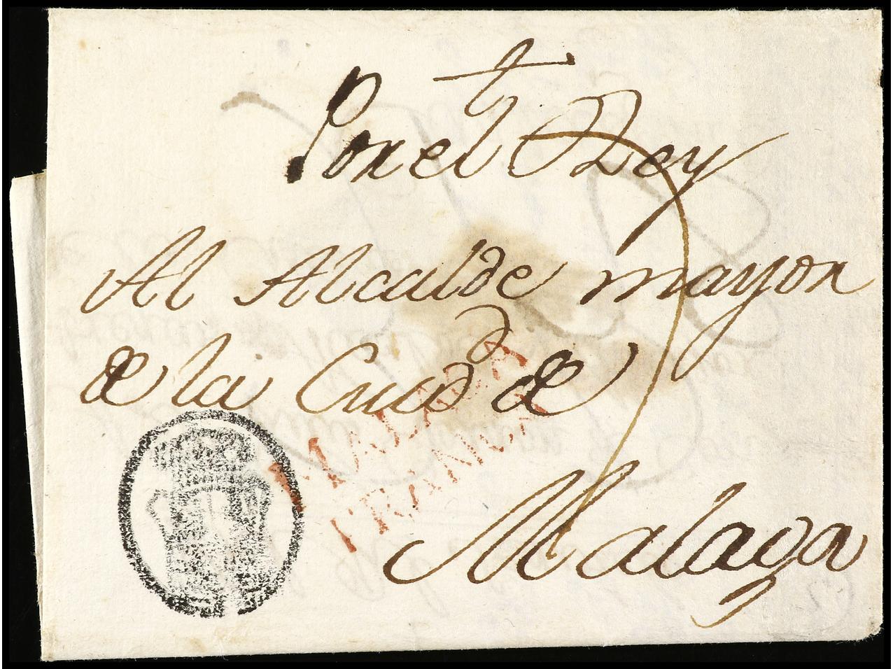 ESPAÑA: PREFILATELIA. 1789. MÁLAGA. Envuelta a MÁLAGA. Marca MÁLAGA/FRANCA (P.E. 19) en rojo. RARA. (Image1) (Image2)