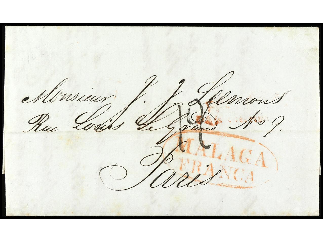 ESPAÑA: PREFILATELIA. 1838. MÁLAGA. A PARIS. RARA en rojo MÁLAGA/FRANCA (P.E. 21). PRECIOSA. (Image1) (Image2)