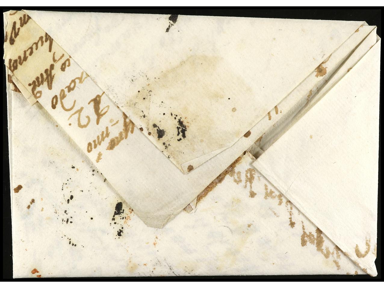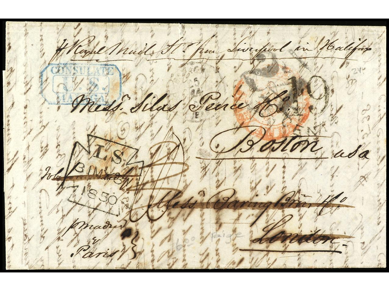 ESPAÑA: PREFILATELIA. 1850. MÁLAGA. Sobrescrito a BOSTON. Marca en azul U.S./CONSULATE/MALAGA (P.E. 31). (Image1) (Image2)