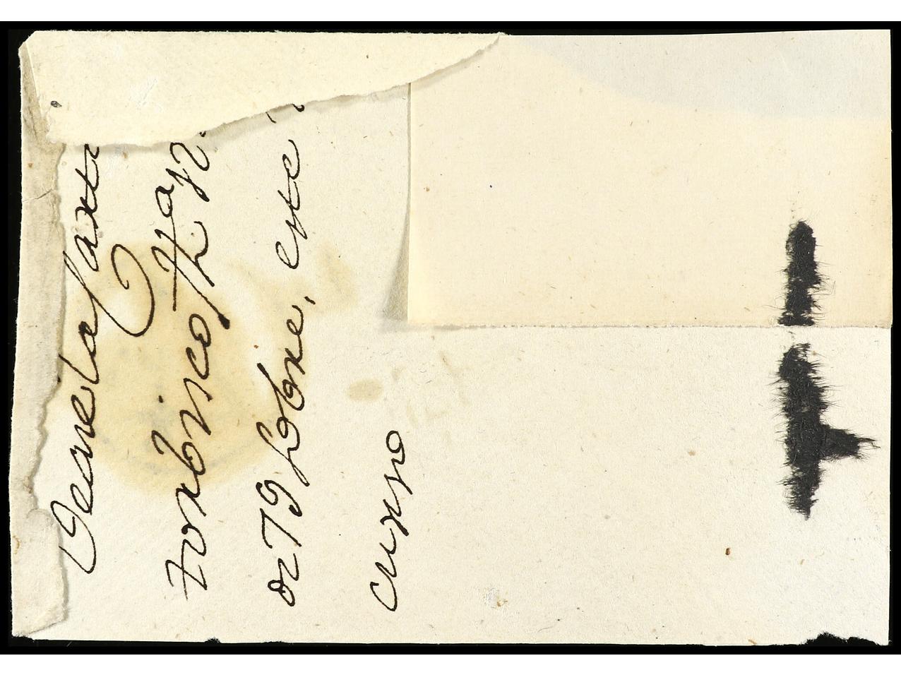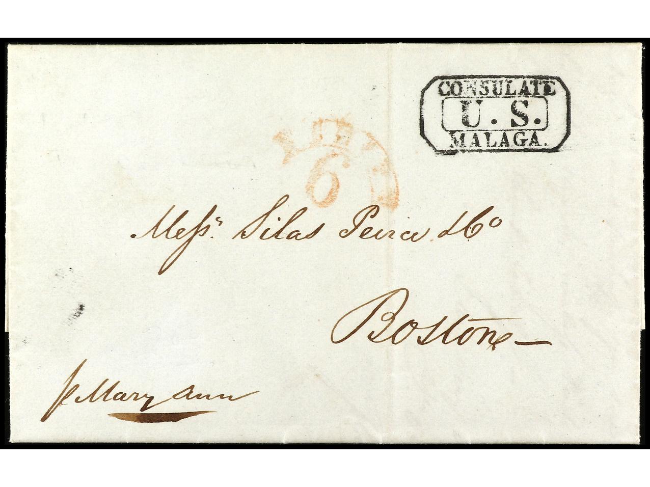 ESPAÑA: PREFILATELIA. MÁLAGA. Sobrescrito a BOSTON Marca en negro U.S./CONSULATE/MALAGA (P.E. 31) Gran calidad. RARÍSIMA (ext.). (Image1) (Image2)
