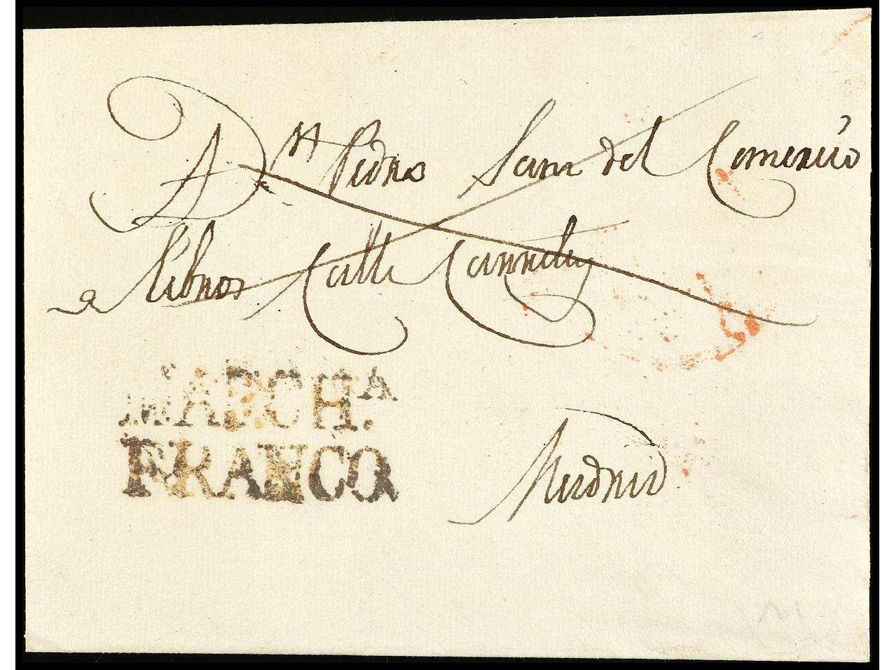 ESPAÑA: PREFILATELIA. 1831 ca. Envuelta con fecha ilegible, a MADRID. Marca en rojo MARCHA/FRANCO (P.E. 5). PRECIOSA y RARÍSIMA (ext.). (Image1) (Image2)