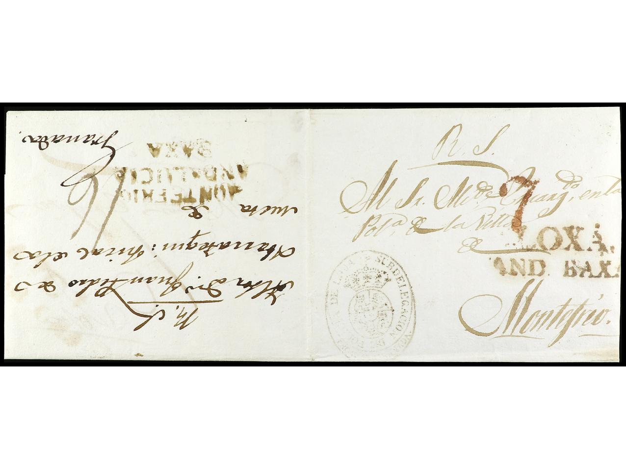 ESPAÑA: PREFILATELIA. 1830 ca. MONTEFRIO. Envuelta sin fechar reutilizada 3 veces. Circulada LOJA, luego a MONTEFRIO y finalmente a GRANADA. Marcas LOXA/AND. BAXA y MONTEFRIO/ANDALUCIA/BAXA (P.E. 1). RARA. (Image1)