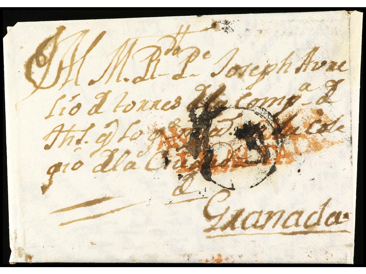 ESPAÑA: PREFILATELIA. 1766. PALMA DEL RIO. Sobrescrito a GRANADA. Marca en rojo ANDALUCIA/LA ALTA (P.E. 1). RARÍSIMA (ext.). (Image1) (Image2)