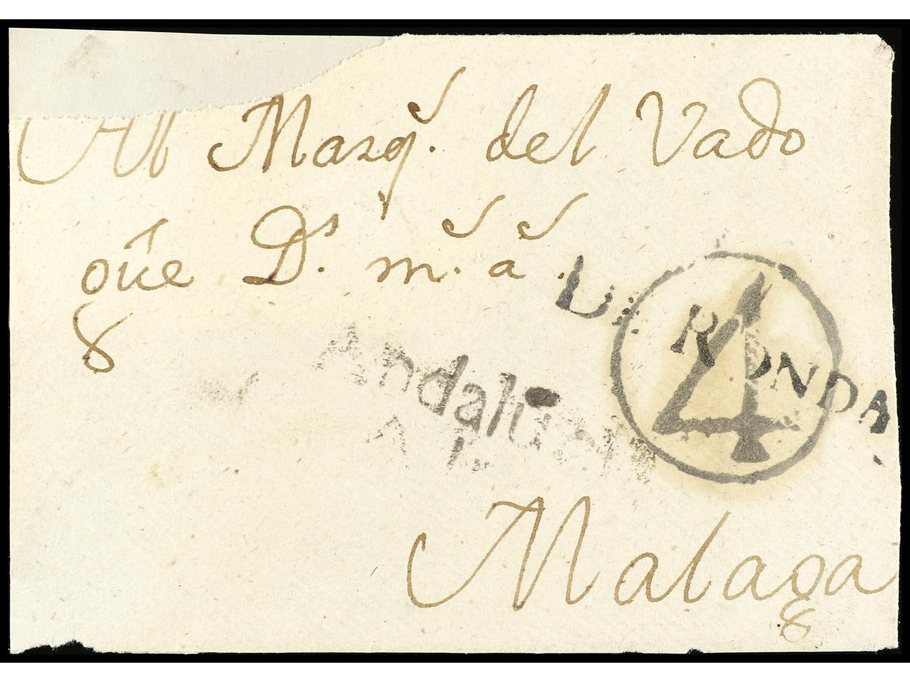ESPAÑA: PREFILATELIA. 1779 (12 marzo). RONDA. Frontal de carta fechado (falta reforzada en esquina superior izquierda) con marcas DE RONDA en negro (inédita) y ANDALUCIA/ALTA en tránsito de SAN ROQUE en negro. Marca de porteo de cuño de