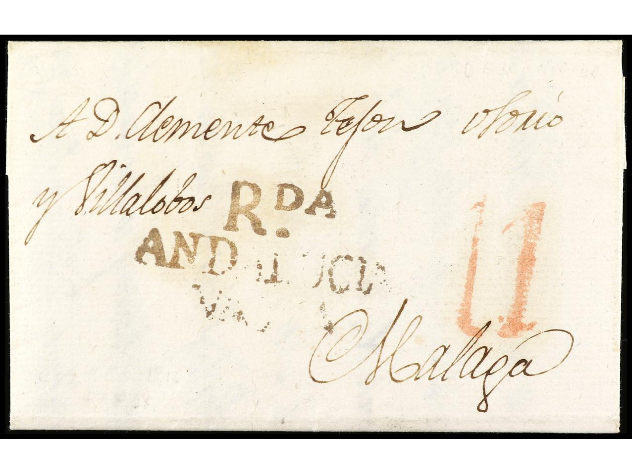 ESPAÑA: PREFILATELIA. 1816. CORTES (de La Frontera) a MALAGA. Marca RDA/ANDALUCIA/VAXA (P.E 2) en rojo. RARA. (Image1) (Image2)