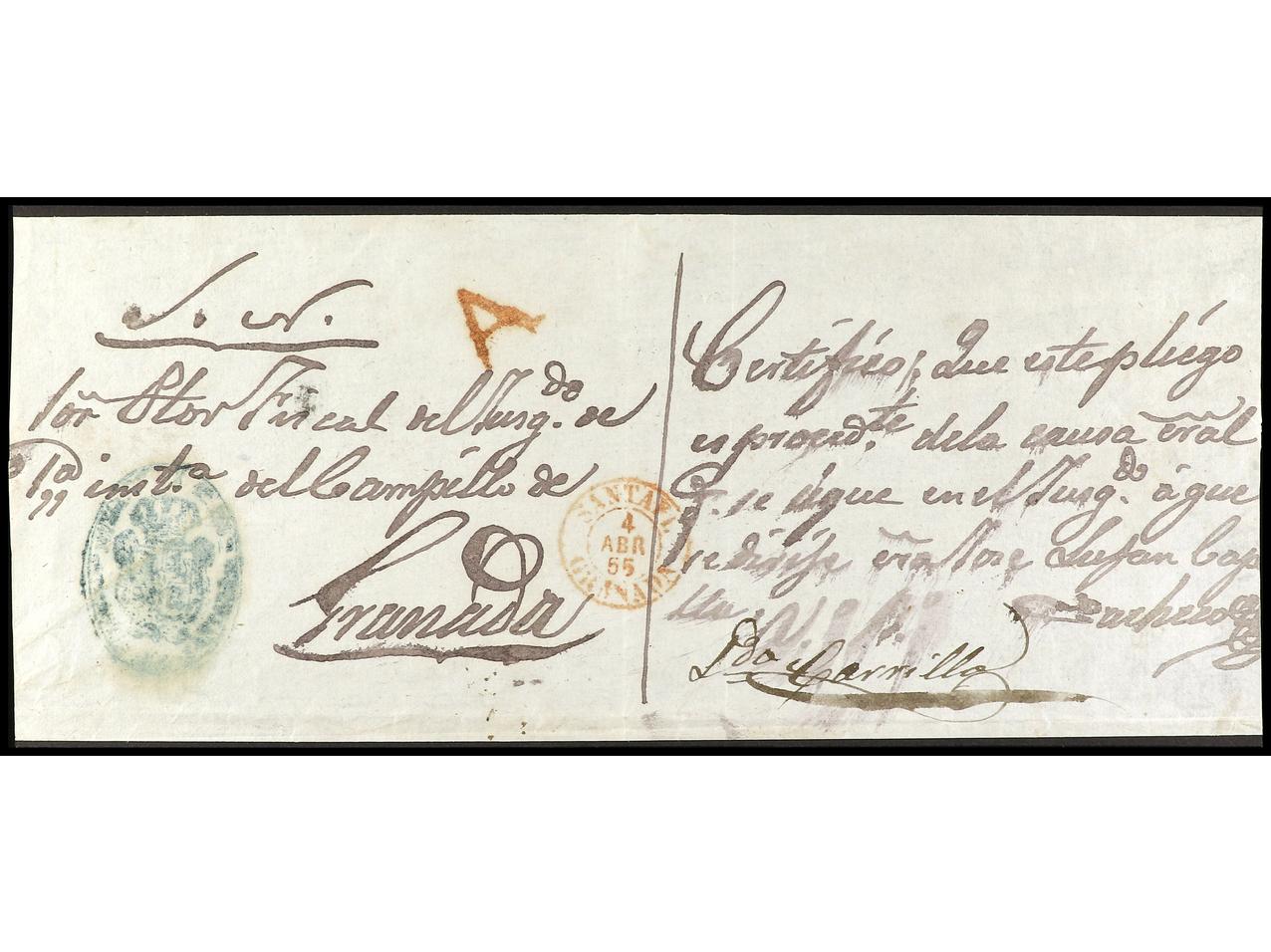 ESPAÑA: PREFILATELIA. 1855. SANTA FE. Frontal a GRANADA. Marca A (P.E. 3) en rojo. PRECIOSA y MUY RARA. (Image1)